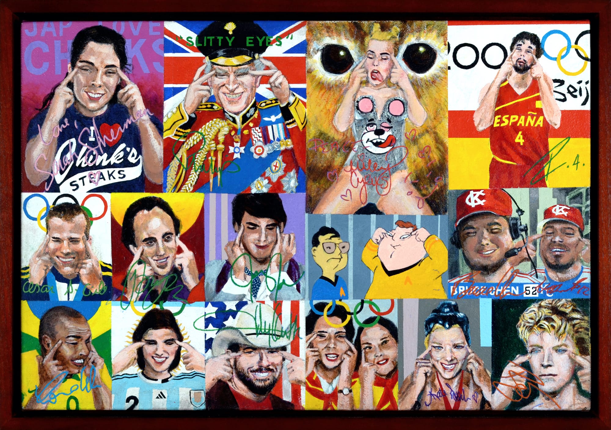 LOS ANGELES — Gut-wrenching is the only word that can aptly describe Chinatown, a solo exhibition of works by Ben Sakoguchi at Bel Ami. At the center of the exhibition is Sakoguchi’s eponymous painting, an epic illustration of the Asian American experience spread across 15 panels. Each panel is a history lesson in miniature, ranging from the anti-Asian political propaganda accompanying the Chinese Exclusion Act of 1882 to the brutal murder of Vincent Chin 100 years later, in 1982, to the commonplace stereotypes of Asians today perpetuated by Hollywood, exemplified by famous comedians and athletes alike pulling the corners of their eyes into slits.