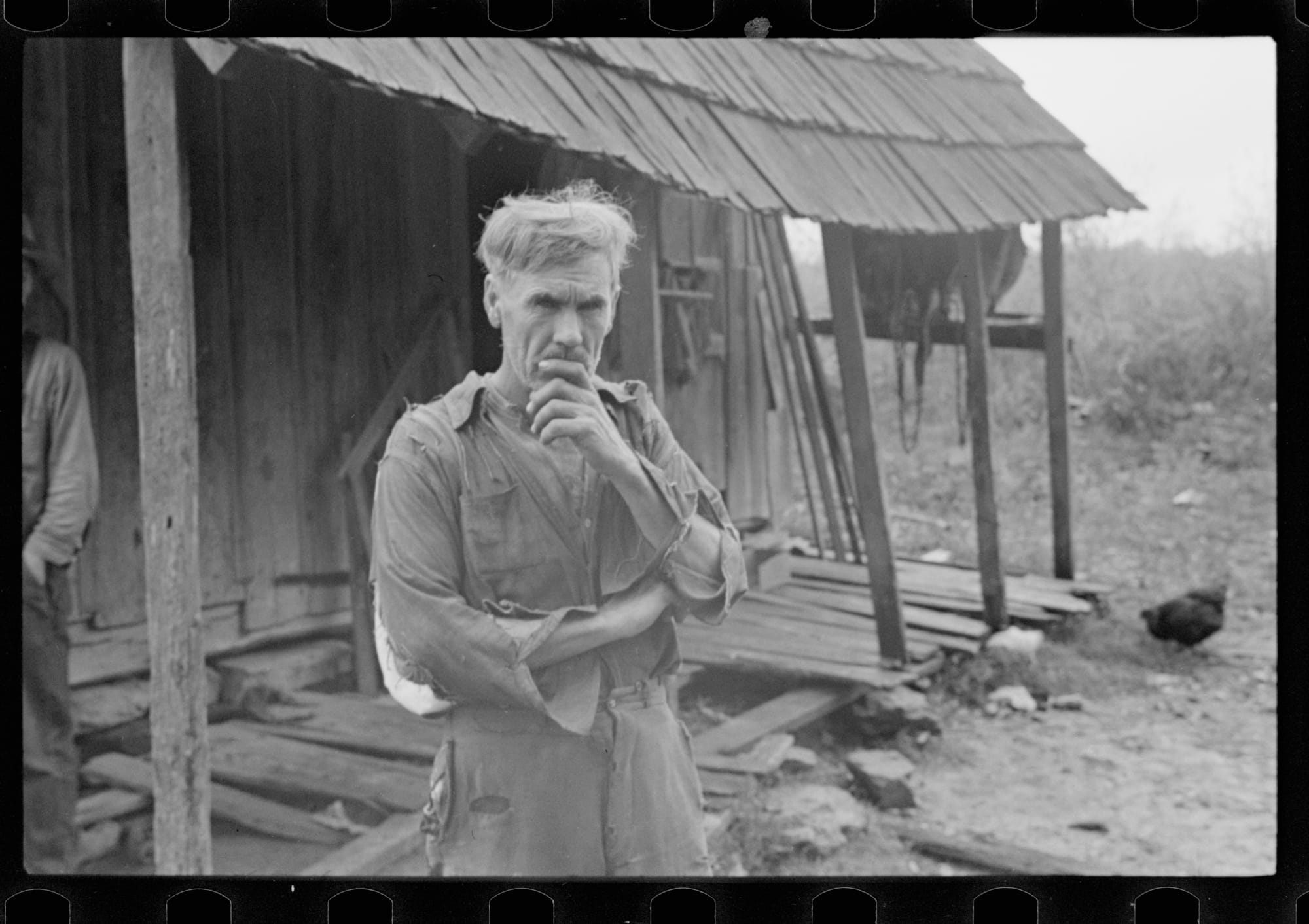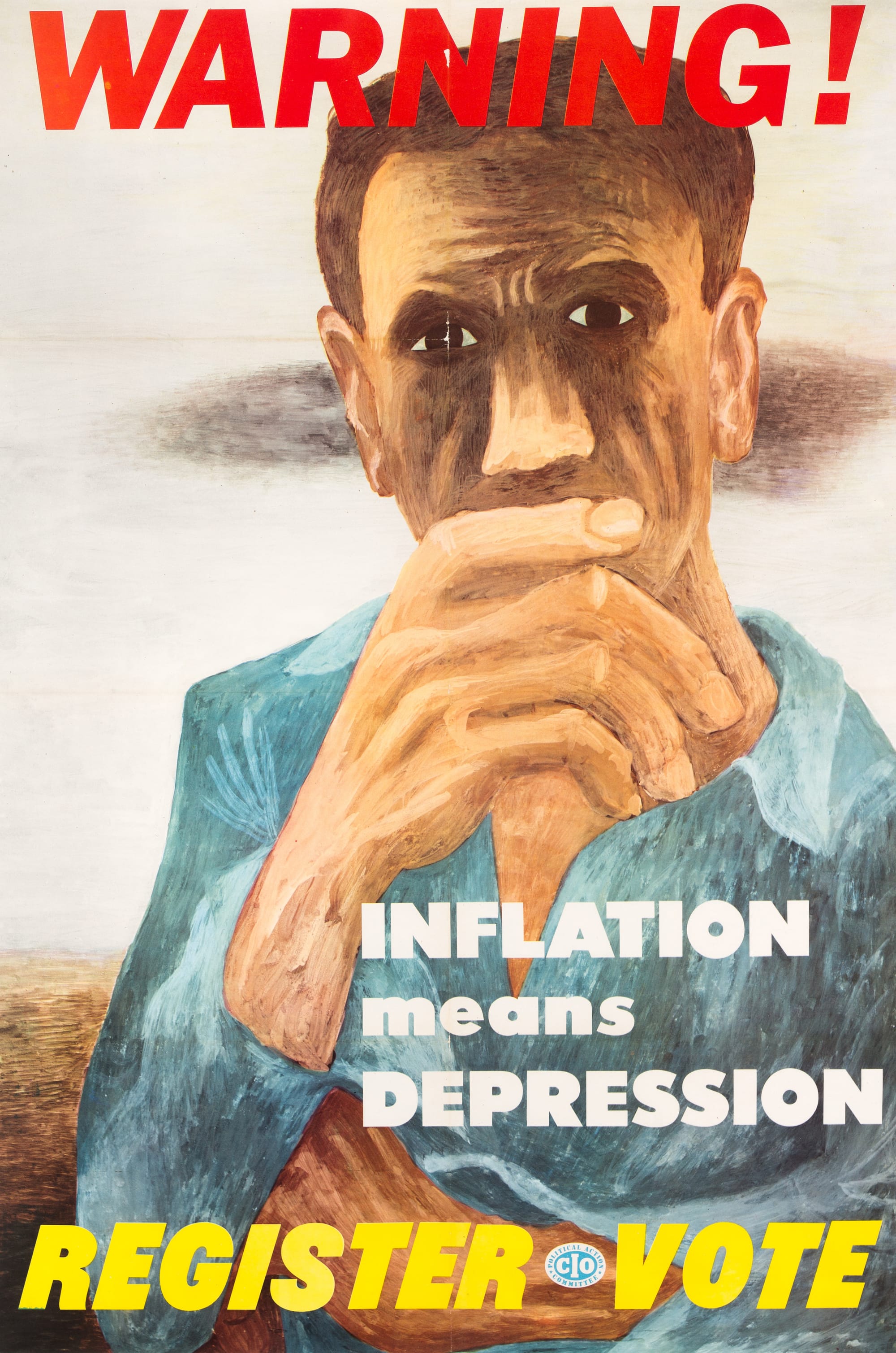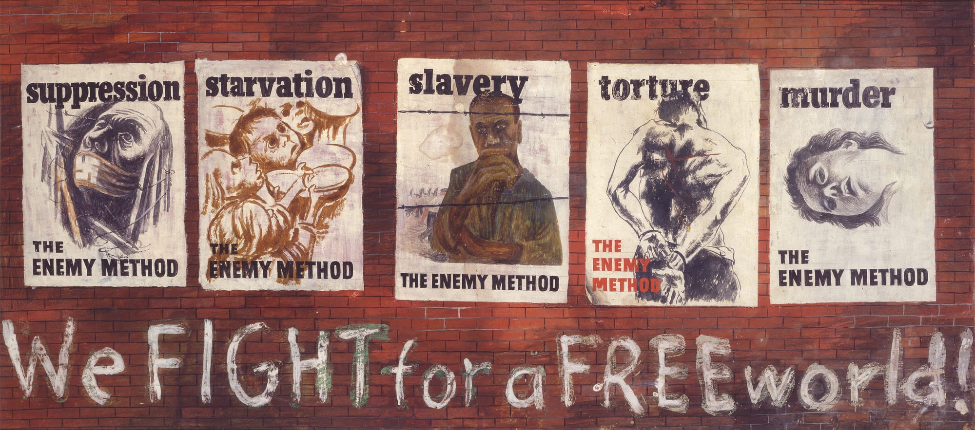 Shahn’s curious, spontaneous photos of storefronts, laborers, farm workers, and other subjects trace the artist’s growing social consciousness. These pictures would also crucially shape his artwork for years to come. A handful of visual motifs resurface throughout the exhibition as Shahn recycles and re-presents them in new contexts. A compelling catalog essay by Christof Decker traces how one such image, Shahn’s photo “Sam Nichols, tenant farmer, Boone County, Arkansas” from 1935, is repurposed in three subsequent projects: a never-realized 1942 poster design for the US Office of War Information, a piercing painting from 1943, and a poster for the Congress of Industrial Organizations-Political Action Committee in 1946. Along the way, the man from Shahn’s original photo transforms from a farmer in the American South to a prisoner in a European concentration camp and back again to a struggling farmer in the US.