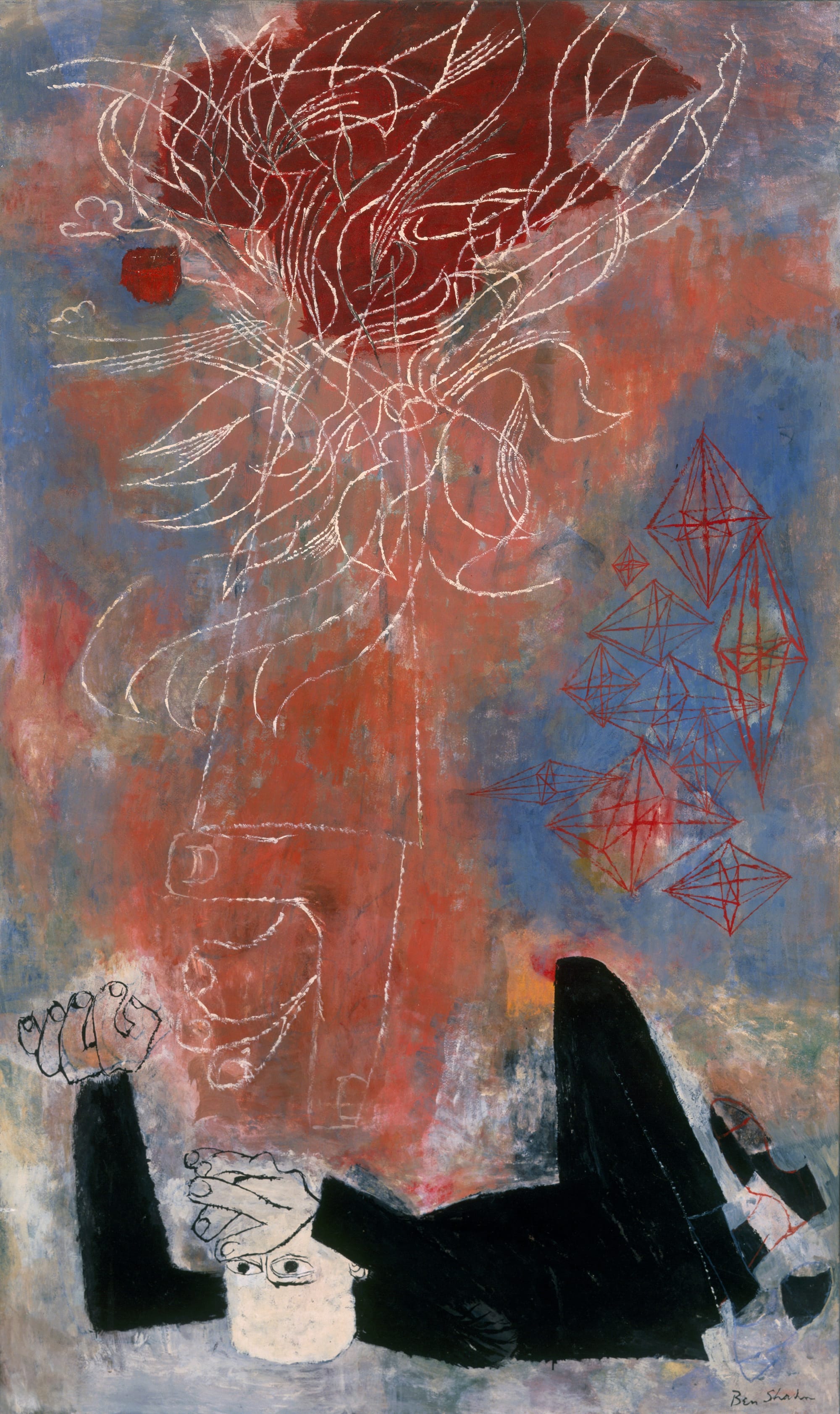 Benjamin Zwi Shahn was born in 1898 in Russian-controlled Lithuania to a working-class Jewish family. As a child, his anti-Tsarist father was exiled to Siberia, an event that would influence Shahn’s later commitment to advocating for the underdog. Remarkably, his father was able to reunite with the family when they immigrated to New York City in 1906. There, Shahn grew up in the immigrant neighborhoods of Brooklyn, pulled between his Yiddish-speaking Eastern European roots and more mainstream American currents.