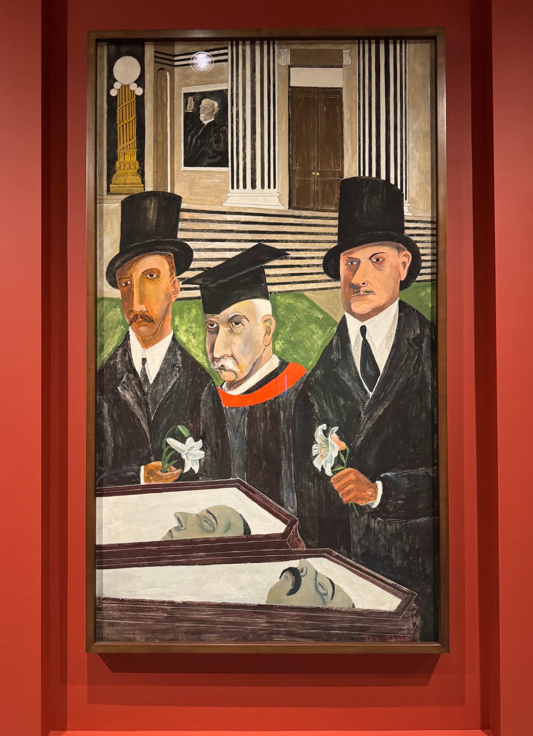It may not look that way at first. The show begins with his painting titled “The Passion of Sacco and Vanzetti” (1931–32) set against a blood-red wall. Three judges gaze down at the coffins containing the graying bodies of the two famous Italian anarchists, likely falsely accused of murder. Their faces are smug, mildly irritated, even bored. At once realistic and slightly distorted, Shahn’s thick, wavering lines retain his trademark scratchy texture and vibrant hues. Next to the painting is the quote from Shahn that supplies the show’s title: