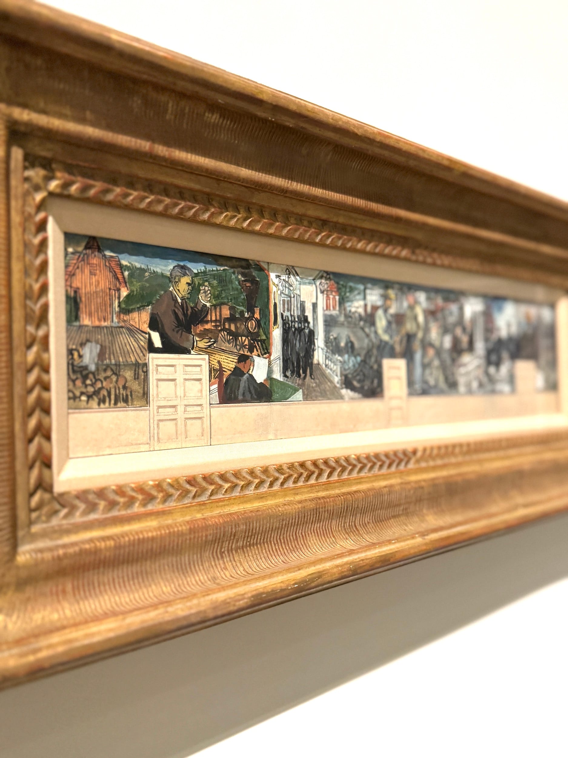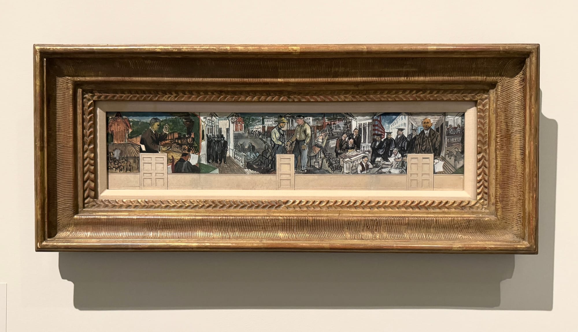 But we get barely a glimmer of one of Shahn’s most resplendent eras: the New Deal murals. The exhibit includes just one small painting, a study for a mural entitled “The Great State of Wisconsin,” with no context, or explanation that the mural proposal was rejected (it is unclear why).