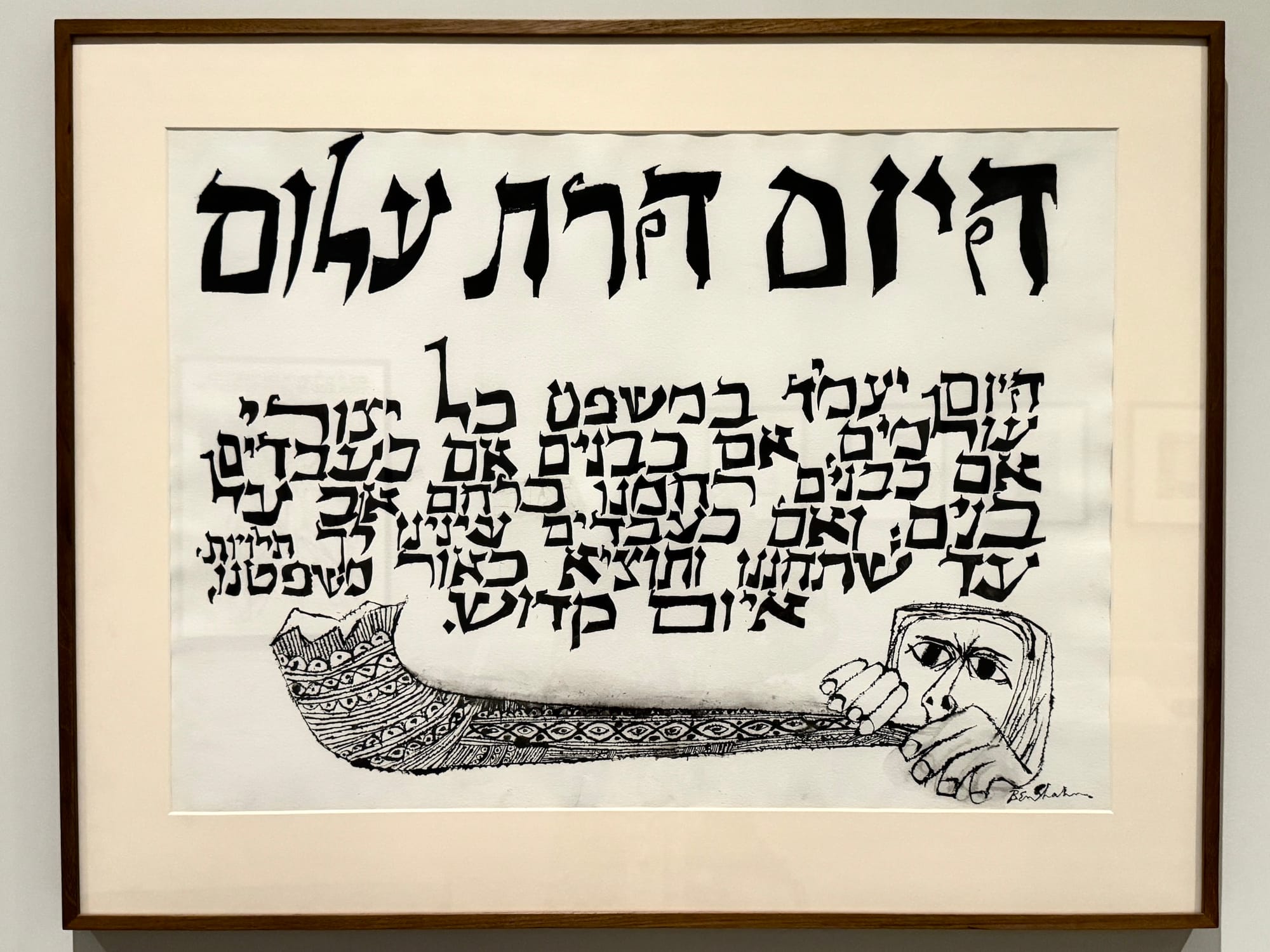 The rooms that follow display a delightful sample of Shahn’s work: posters he created while directing the Graphic Arts Division at the newly formed Congress of Industrial Organizations (CIO) and participating in the antifascist efforts of the Office of War Information (OWI); photos he took for the Resettlement Administration/Farm Security Administration (RA/FSA) showing the plight and strength of American farmers during the Dust Bowl; and political cartoons for the Progressive Party poking fun at politicians. These are presented alongside an impressive swath of his paintings, from surreal dreamscapes memorializing the horrors of the Holocaust to flame-engulfed monsters that raise alarm about the dangers of nuclear warfare to bittersweet reflections on the beauty of everyday life. The final gallery shows his late-in-life foray into Hebrew lettering, including illustrations of classic Jewish texts, which at once offer tender comfort to their viewers and invoke the cosmic eternity of God’s power.