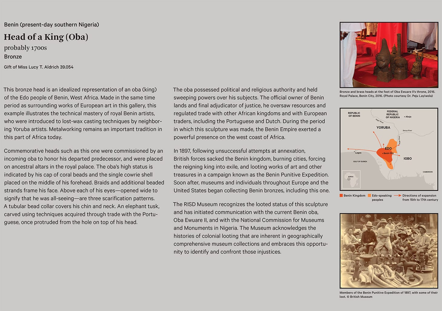 GB:​ Now the work is shown in relationship to the colonial history of the period and we discuss its use in coronation of the most recent Oba. And then, by its side is a map showing where it is from, and then a photograph from 1897 where you see British troops with the spoils of conquest. Our last paragraph makes clear that we are acknowledging the problematic history of this piece.