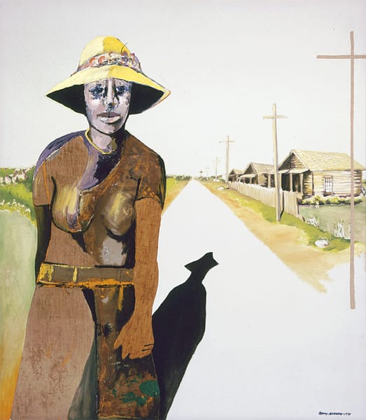 A solitary woman trudges down a stark country path in Benny Andrews’s painting “Down the Road” (1971). Her only companion is a long, black shadow. The image is as rough as the subject’s burlap dress, which conceals large pendulous breasts. Just over her shoulder, a patchwork of wooden shacks and utility poles recede in the distance, wilting under hot daylight. What makes this painting distinctive is the woman’s nose, which juts out from the canvas like a fetid, cantankerous growth. The effect is startling. Andrews developed a rough collage technique, which married rugged scraps of cloth and paint to canvas.