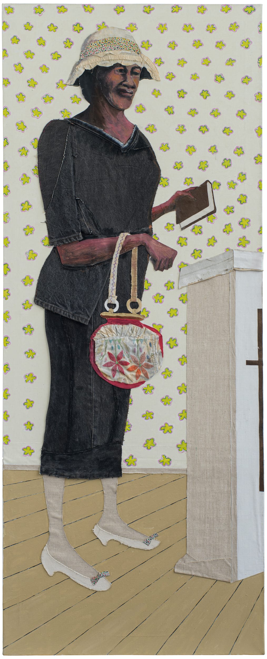 One notable compositional device, in works such as “For Colored Girls” (1977), or “Funeral” (1977), pairs individuals with vases of flowers. The flowers, hovering in the foreground or to the sides, appear like small blessings consecrated in bursts of color. The figure is often placed within an undefined background, allowing the forms and collaged textures to play brightly, as if on a stage. Andrews’s portraits stretch toward representing types as much as individuals (e.g., the mourner, the artist). “Viola Andrews Teaching Sunday School” (1989) shows his mother dressed in dark Sunday clothes, holding a Bible. Andrews renders her in a full-length pose, historically reserved for aristocracy. A fancy, floral purse dangles daintily from her wrist but her fist is clenched. She appears both kind and strong, at once a singular woman and a symbol of women who serve as church and community leaders. Andrews applies scraps of cloth to form her clothes, once again using rough collage to bind the elevated finesse of painting to the places and histories that inform his life, such as the make-do quilting practices of rural Black communities.