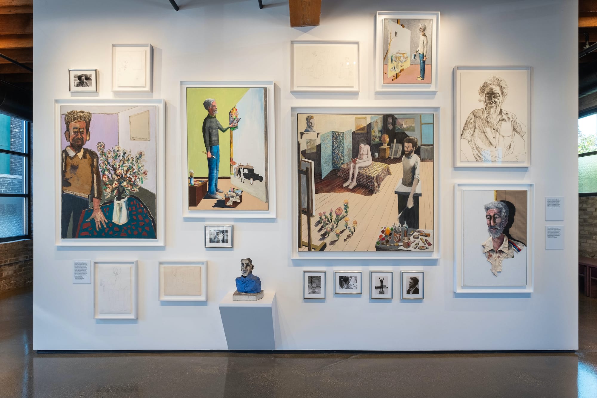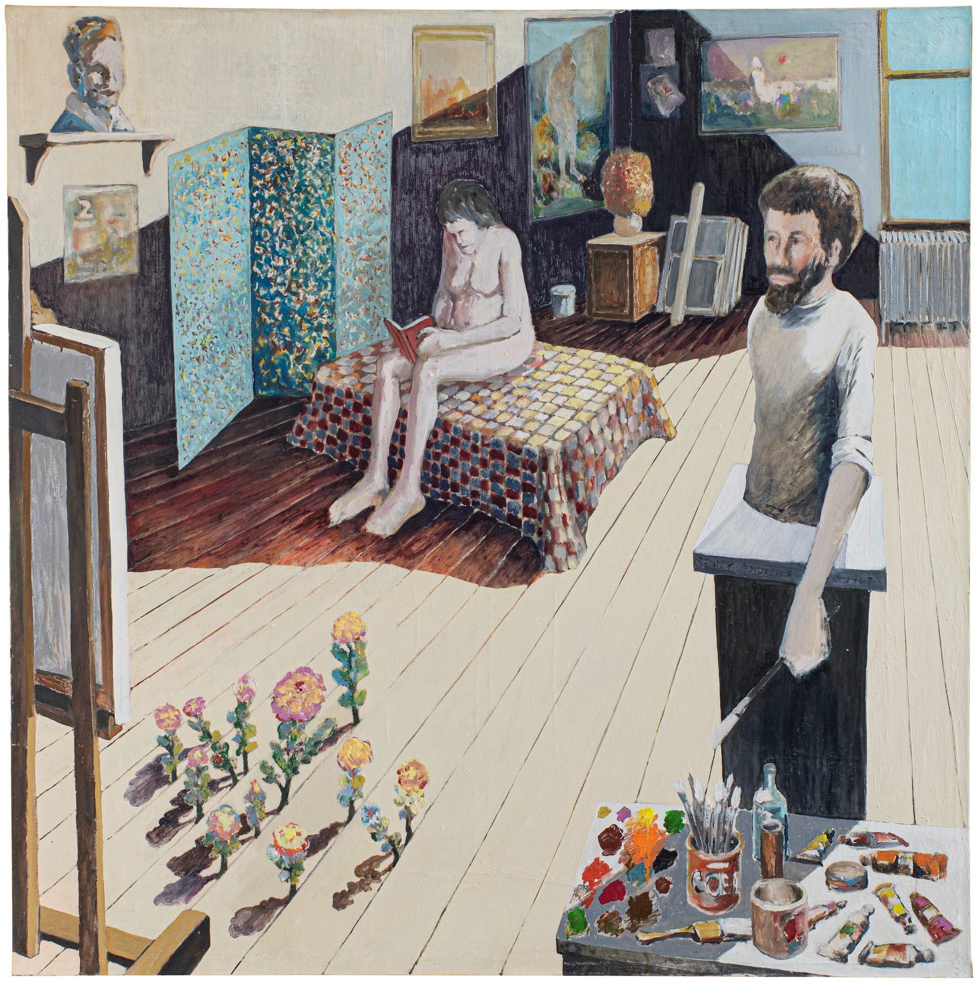 A nearby wall displays multiple self-portraits. We see Andrews as a young man in his studio in “Studio” (1967). He faces a canvas, holding a brush. His torso is entombed in a pedestal, as if he and the studio are one. His friend Alice Neel is in the background, sitting naked on a plinth, reading a book. The ever-present flowers bloom from the wooden floorboards. Andrews is a tall, skinny guy with a beard. He stares at the canvas with the universally quizzical face of an artist contemplating his own work. This piece is surrounded by drawings, a small sculpture, and several other paintings of the artist in the studio, as well as a 1978 lithograph by Neel showing Andrews in a wrinkled work shirt.