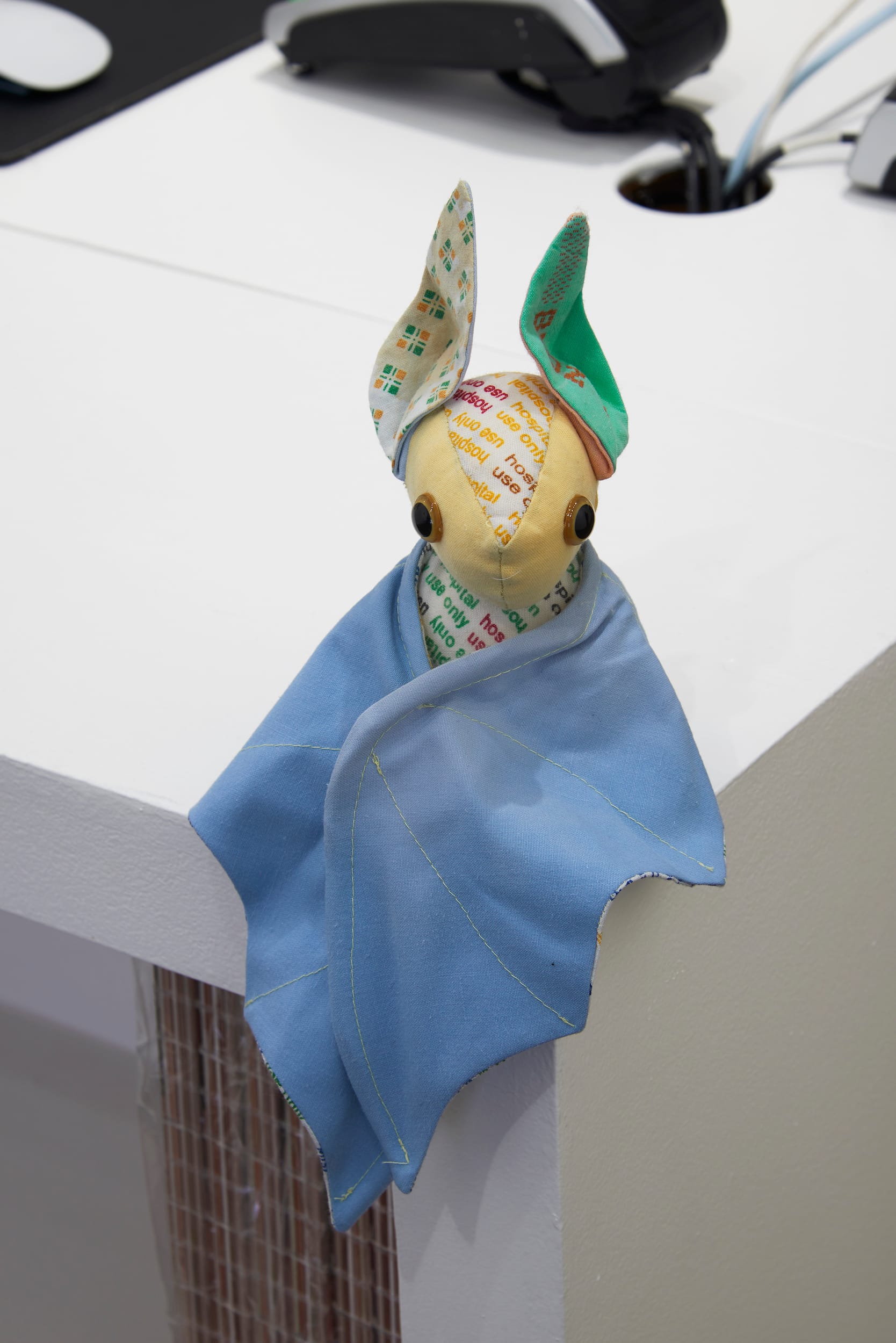 The suspended structure is anchored to a three-meter wood table leg topped with an equally oversized pin cushion. Its scale and totemic shape evoke a talisman, conjuring a protective spirit. “Monica” (2023), a small soft toy bat sewn by Piéron from recycled hospital gowns, located at the gallery entrance, also provides a sense of animist protection, like the plush toys children often receive in hospitals to comfort and mitigate trauma.