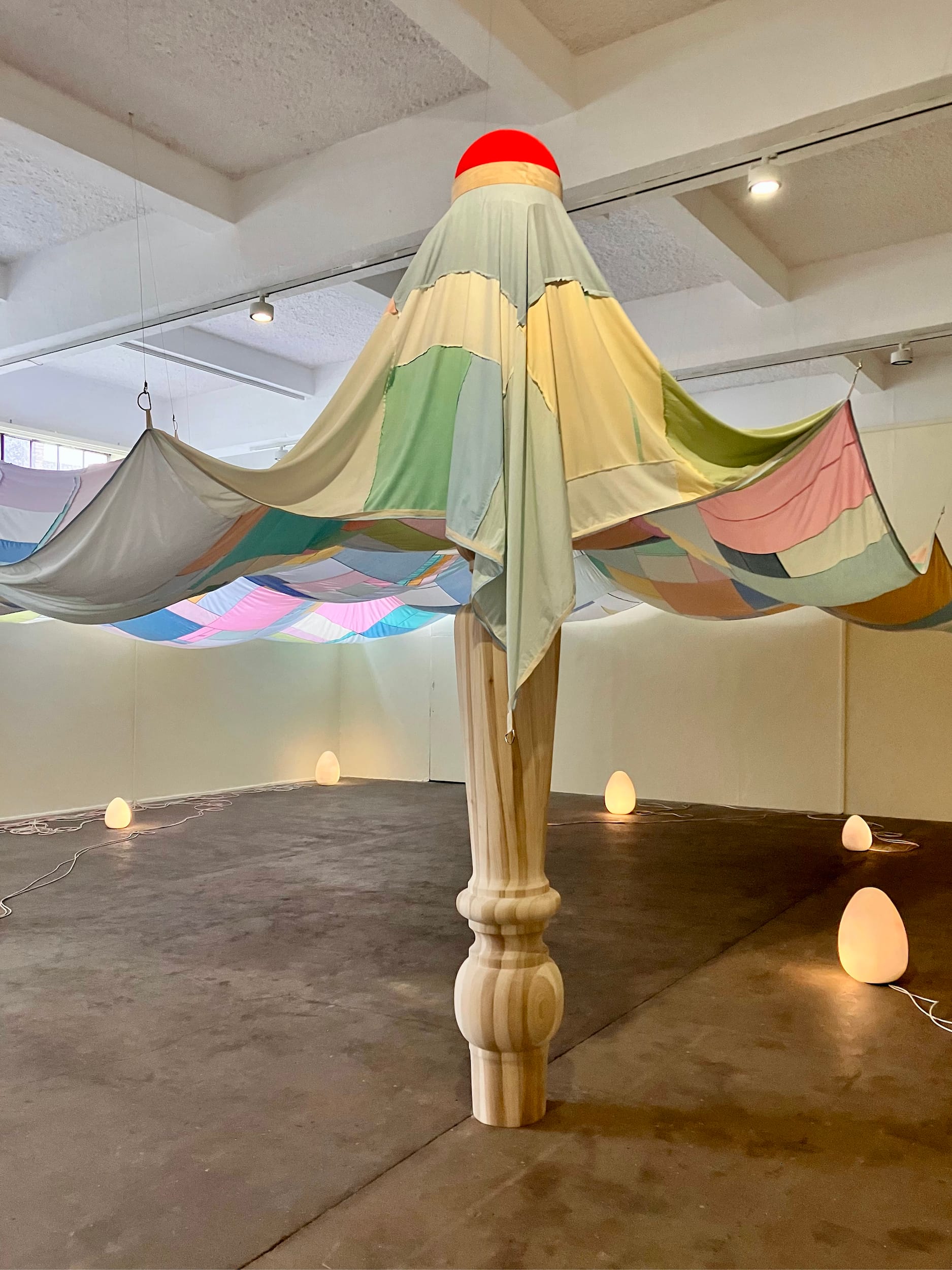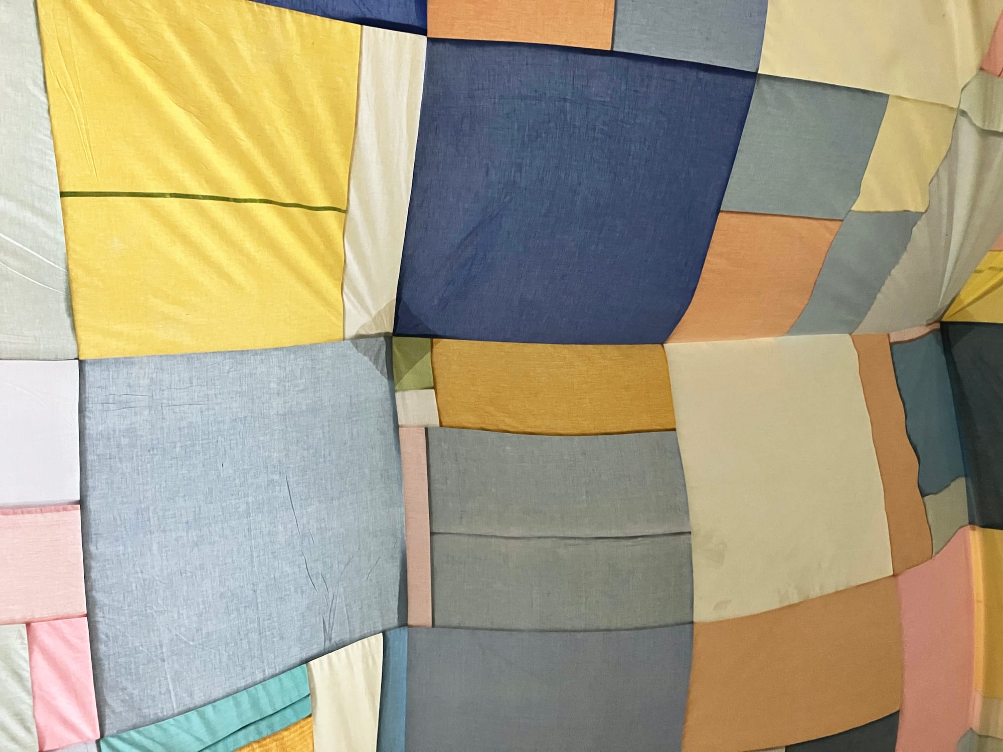 The construction of the patchwork in this context draws parallels between a sewing “stitch” and medical “stitches,” redefining it as both a protective covering and a skin. These parallels are reinforced by visible stains and markings on the multicolored canopy. Such traces resonate with the tradition of storytelling in quilt-making and the individual narratives that inhere in each piece of repurposed cotton. The narratives, though unarticulated, feel honored by the artist.