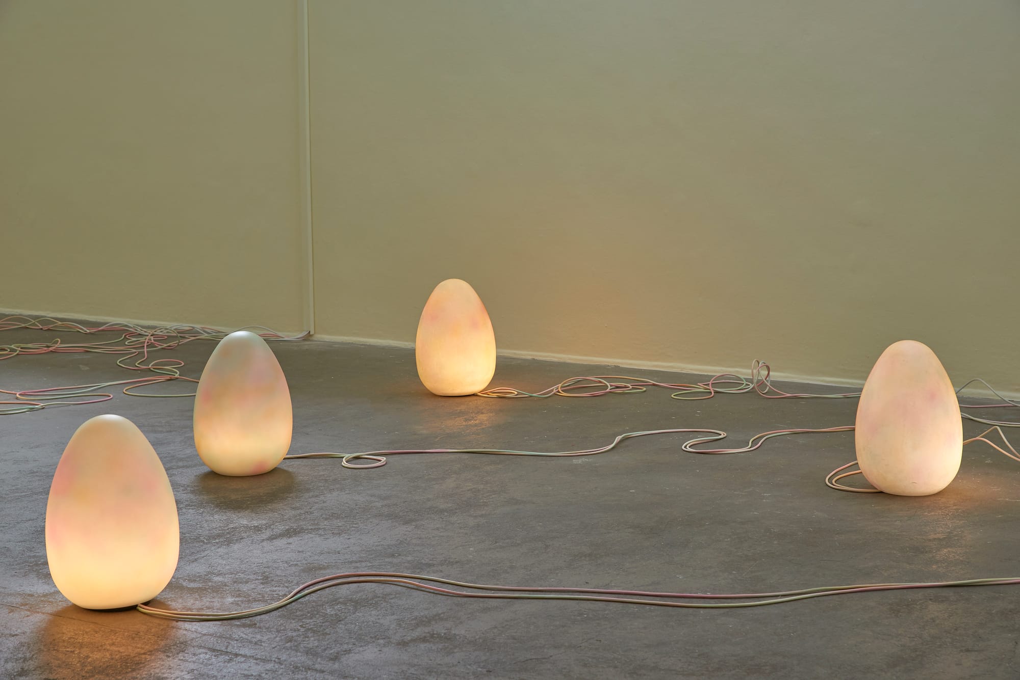 Fifteen egg-like domes, each of them containing a revolving and flashing emergency light, are scattered across the gallery floor. Collectively titled “Radical Softness” (2023), the usual fast-paced strobe, synonymous with trauma, is here slowed, its appearance distorted by a wash of pastels, rendering the light softer and less severe. This mechanical changing of rhythm reminds us that time is elastic and personal.