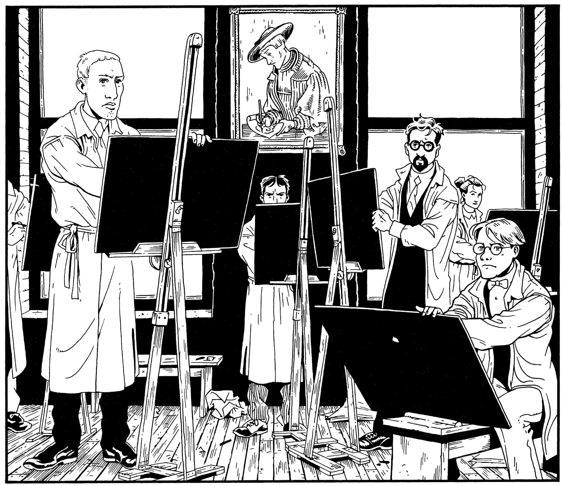 Lutes has a detailed bibliography for the series which demonstrates the breadth and scope of his research into the subject matter. With the complete freedom offered by the page, he has faithfully recreated the times lived between 1928 and 1933. The geography of the city, the clothing different people wear, the songs they sing, the ads and propaganda they look at — all of it is meticulously sourced and rendered.