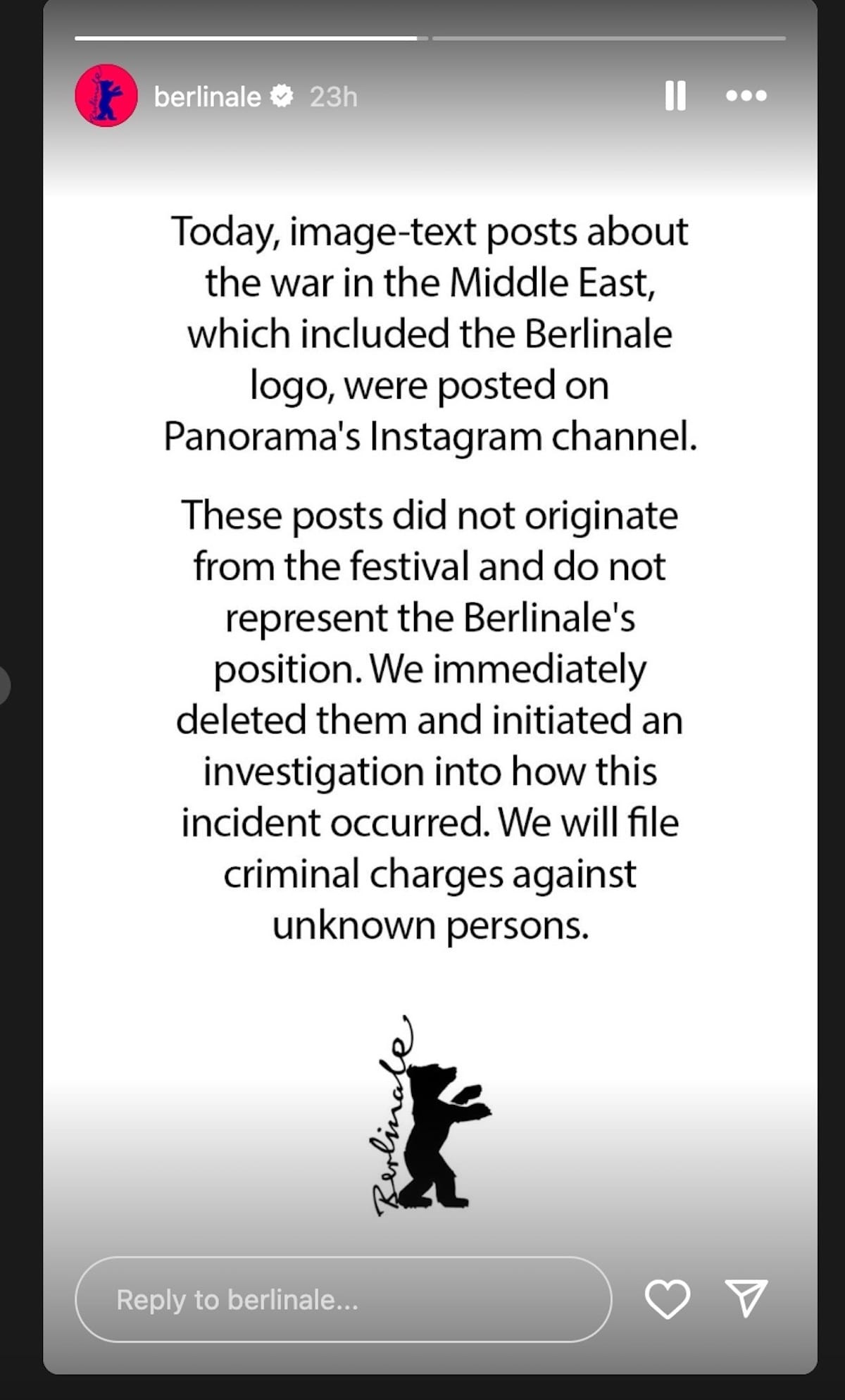 Berlinale quickly deleted the infographic and issued a notice stating it did not represent the festival's views, that an investigation was underway, and that criminal charges would be filed.