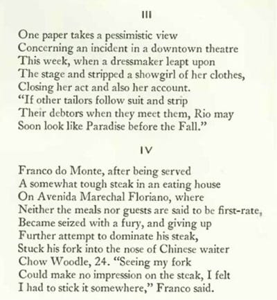Essentially this is prose from the Brazil Herald chopped up into vaguely iambic pentameter lines, which — along with the roman numerals — cast an aura of “poeticity” upon the outrageous, tabloid-like content. O’Connell’s use of the term “happening” conveniently encapsulates the idea of news as a reporting of what happens as well as a sense of Allan Kaprow-like happenings that puncture, however ill-manneredly, the homogenous fabric of everyday life. If not exactly “news that stays news,” “Brazilian Happenings” is both an academic exercise in lineation and a satirical ethnography of people performing badly. It is, unlike Porter’s work, eminently digestible and can sit quite comfortably among New Yorker content. In contrast, this is a page from Porter’s Found Poems, which James Schevill, Porter’s biographer, calls his “breakthrough volume”: