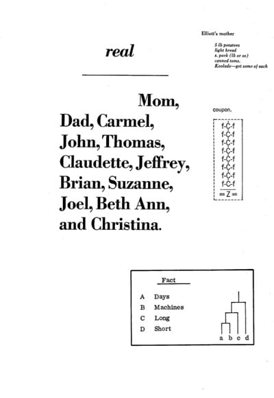 In Found Poems, one might encounter a recipe, a word search, a fragment of an advertisement, a questionnaire, a diagram of circuitry or a technical graph; one even might not know exactly what one is looking at, and Porter’s actions of defamiliarizing and decontextualizing his sources until the point of unrecognizability contributes, to a large extent, to the allure and fascination of the book. Interpretation, in some ways, is too easy for even the most random text, and it can be a refreshing relief not to approach a text “mindwise,” to be given a text that doesn’t even remotely invite analysis. If the students of Stanley Fish’s seminar on seventeenth-century religious poetry were famously able to make poetic sense out of a list of assigned readings left on the chalkboard from the class before — which Fish misled them to believe was also a religious poem (the text in its entirety read, “Jacobs-Rosenbaum / Levin / Thorne / Hayes / Ohman (?)”)—then I wonder what they would have done with this Porter piece (see Fish’s essay “How to Recognize a Poem When You See One”):