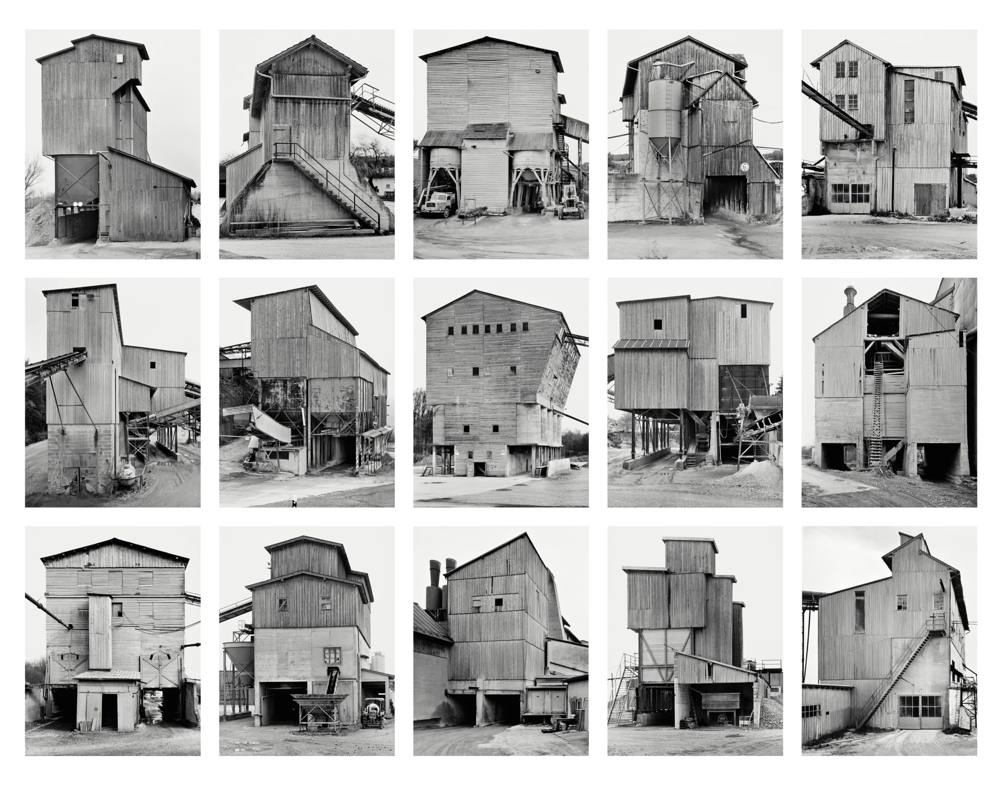 Bernhard “Bernd” Becher (1931-2007) grew up in the thrall of the iron-ore mines that once dominated the landscape of his native Siegerland, Germany; Hilla Wobeser (1934-2015) developed an early interest in photography, leading her to enroll in the Kunstakademie Düsseldorf alongside the young Bernd in 1958. The pair quickly discovered that their personal and artistic interests were complementary and married in 1961. Together, they embarked on a lifelong collaboration, driving across countries in a Volkswagen bus to document an array of vanishing industrial structures: water towers, blast furnaces, coal bunkers, grain elevators, and their ilk, which they displayed in grids grouped by type.
