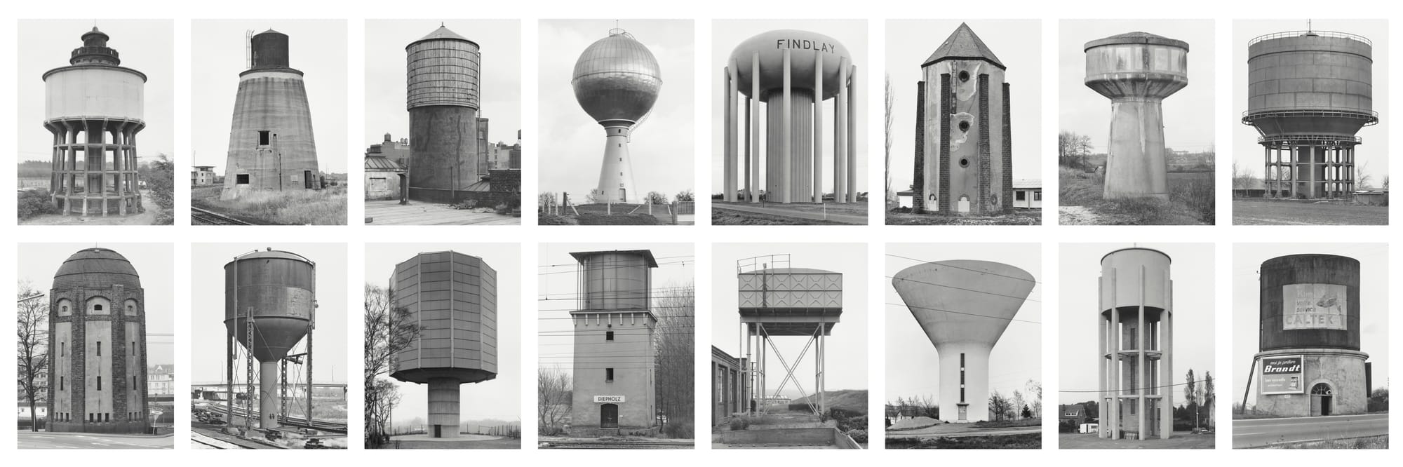 Their typologies evoke the Age of Enlightenment’s impulse toward taxonomy and classification, its desire to scientifically categorize reality. At the same time, the grids are haunted by a perversion of this trend, which measured the circumference of human skulls, reduced human beings to hierarchical orders, and, in World War II, industrialized the process of murder. Despite the Bechers’ problematic treatment of Nazism as the Past-Which-Must-Not-Be-Named, it is no coincidence that they witnessed the imagery of fascism and concluded the opposite: there is no “ideal” water tower.