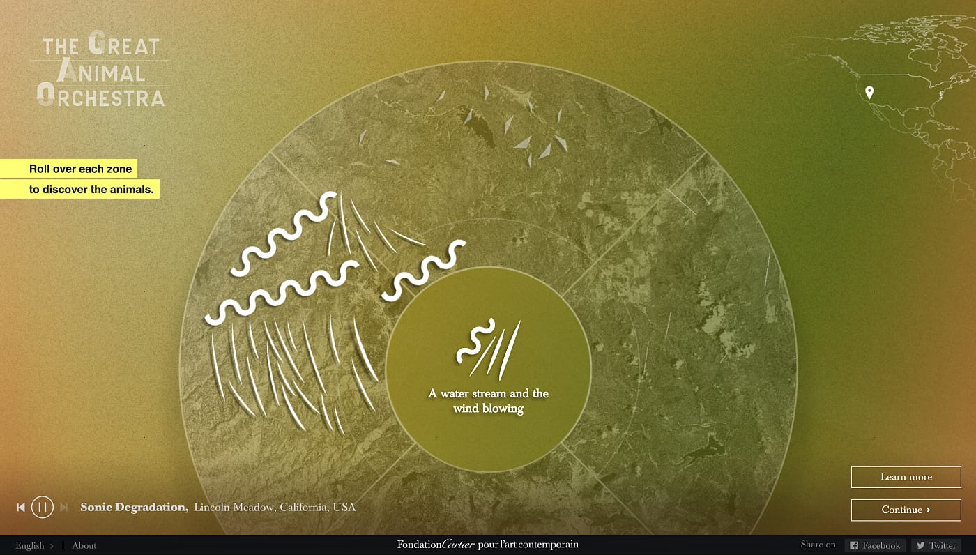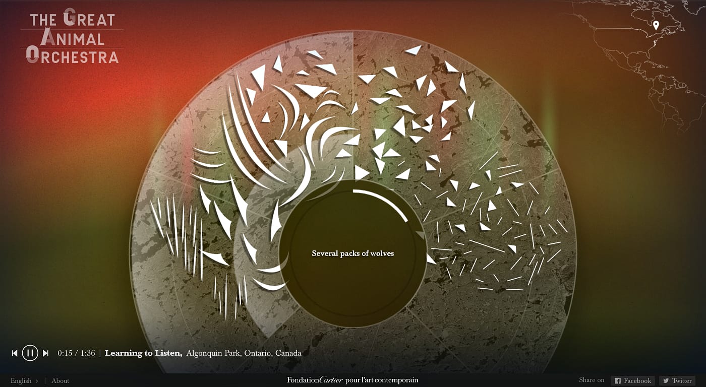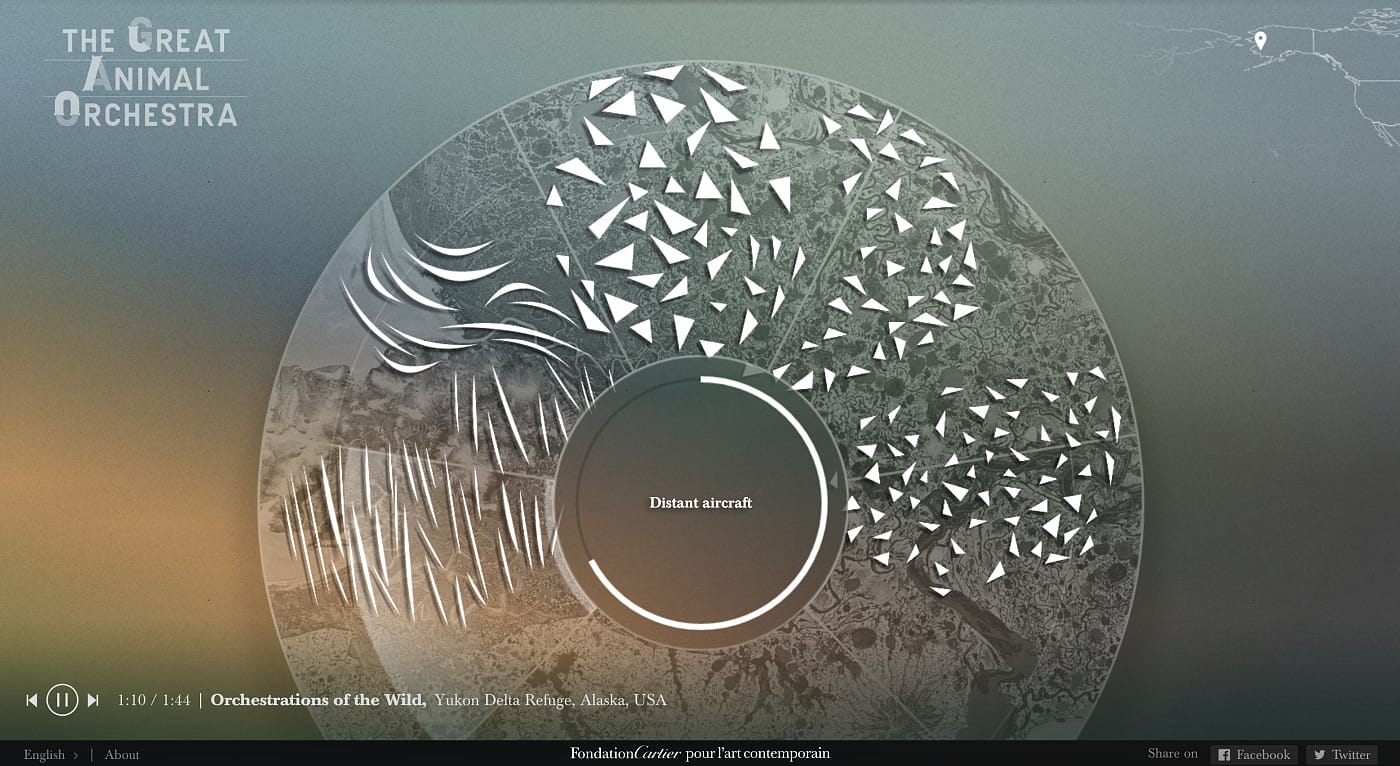 Each is narrated (in the English option) by Krause, who points out different levels in the cacophony. There is the “biophony” with biological sounds (animals), the “geophony” with the non-biological (like weather and waves), and the “anthrophony” with human-made interventions (airplanes, highways, etc.). Users can isolate specific frequencies, and then hear how the shrill insects or low calls of humpback whales fit into the diverse drone.