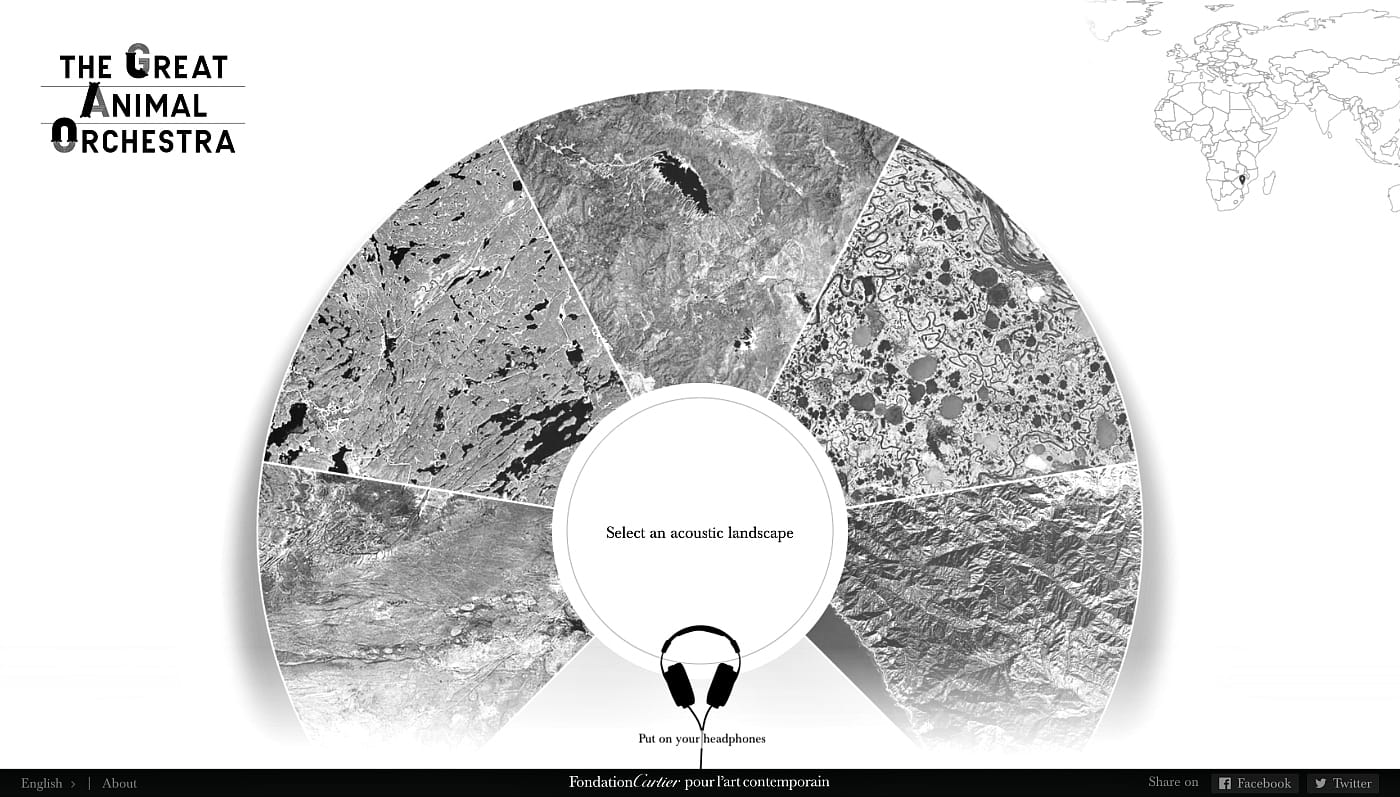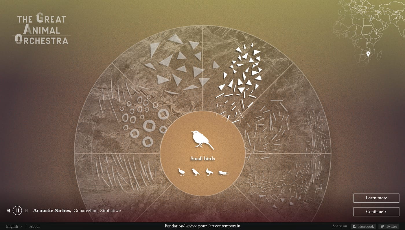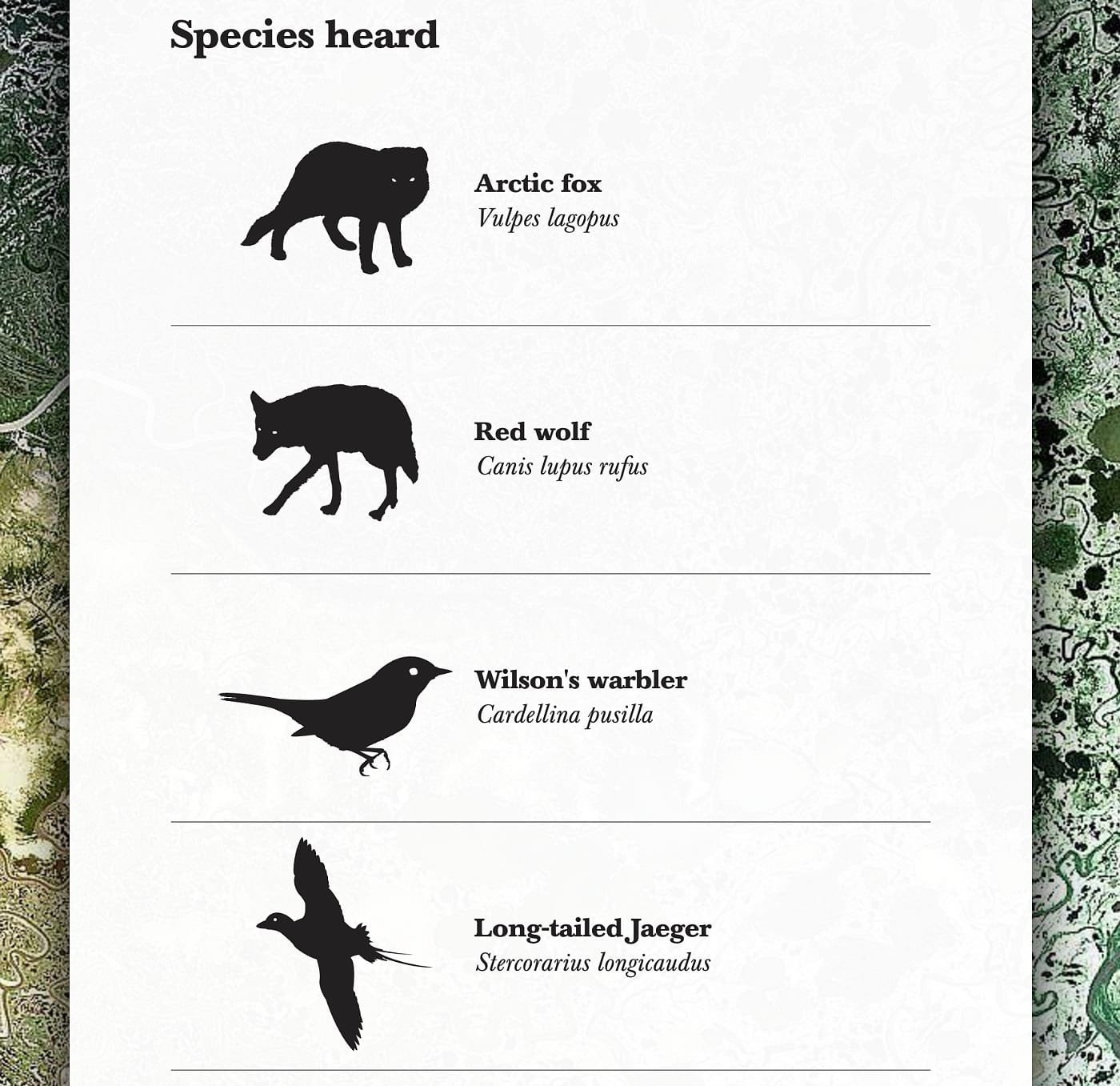 Each is narrated (in the English option) by Krause, who points out different levels in the cacophony. There is the “biophony” with biological sounds (animals), the “geophony” with the non-biological (like weather and waves), and the “anthrophony” with human-made interventions (airplanes, highways, etc.). Users can isolate specific frequencies, and then hear how the shrill insects or low calls of humpback whales fit into the diverse drone.
