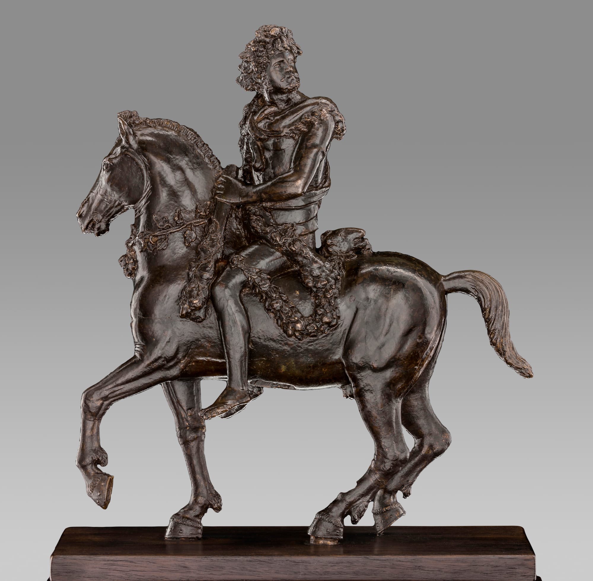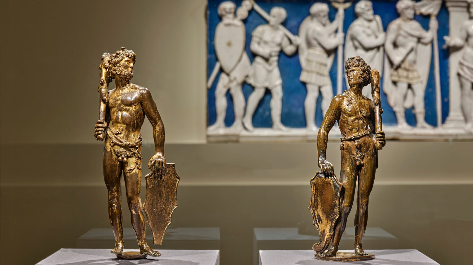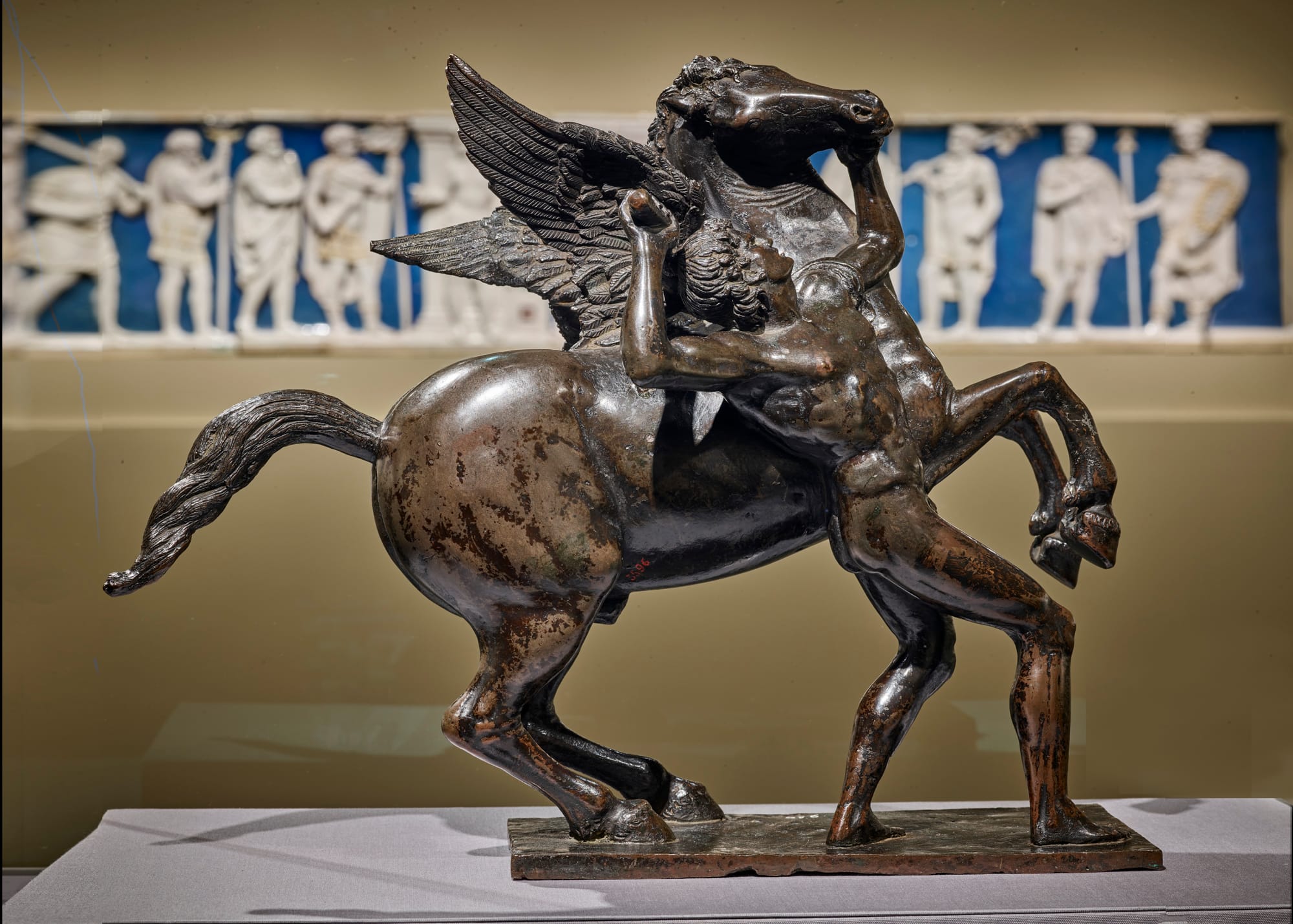 The sculpture “Bellerophon Taming Pegasus” (1480–82) is among the most statuesque male nudes of the Renaissance. It shows the eponymous hero in a contorted display of physical strife as he subjugates Pegasus. Likewise, his twin gilt-bronze statuettes known as “Shield Bearers” (1470–80) evidence a similar insight into the male physique. The so-called “Frick Shield Bearer,” for example, is young, lithe, and supple, while the twin figure, on loan from the Princely Collections in Liechtenstein, is heavier and more muscular.