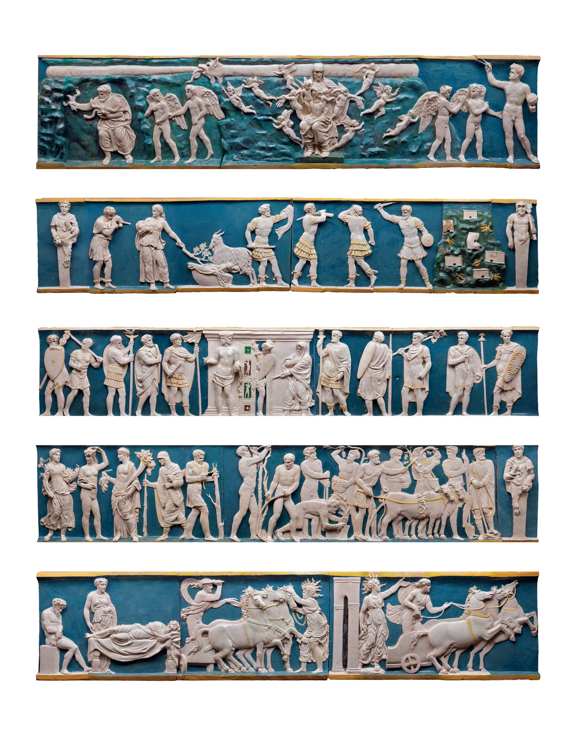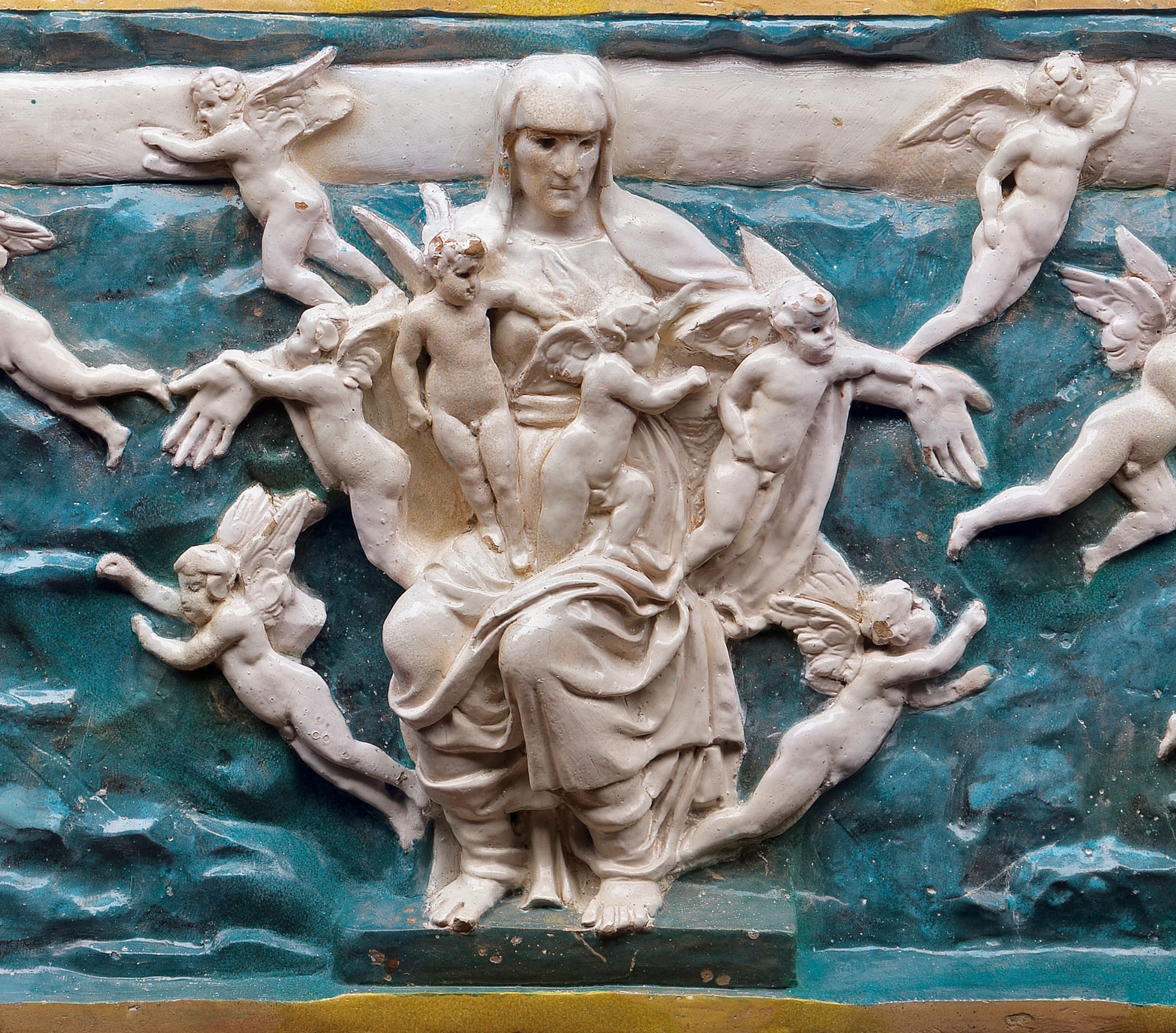 The exhibition’s most imposing work is a frieze that originally adorned a Medici villa in Poggio a Caiano depicting scenes from classical mythology (for instance, the ascent of the god Jupiter, the seasons, Mars emerging from the temple of Janus, and the birth of the day after the night). As an allegory of the deeds of Lorenzo de’ Medici, whose motto was Le temps revient (“the age returns”), it refers to the journey of the soul and the fate of the just and the unjust, inspired by the Platonic myth of Er, a dead warrior who witnesses the treatment of the souls in the afterlife; the presence of Apollo, the Sun god, underscores the presentation of Medici as a ruler.