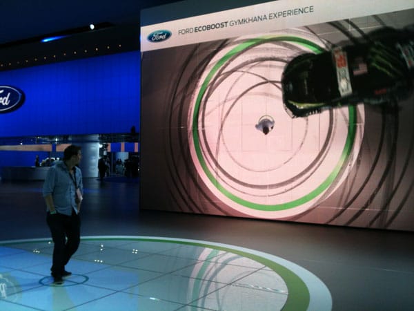 But then I walked into the world of Ford, which provided by far the best visual displays. Ford’s exhibition space transported viewers to a unique environment where they easily wowed more than the other car companies. You initially come across two large green circles on the ground in front of a wall that displays a video. The video at first gives boilerplate information about the various cars around you. When you step on the center of the circle you broadcast on the big screen nearby. Then the screen shows a race car spinning circles around you — a fun video game-like experience and a nice introduction to Ford’s space.
