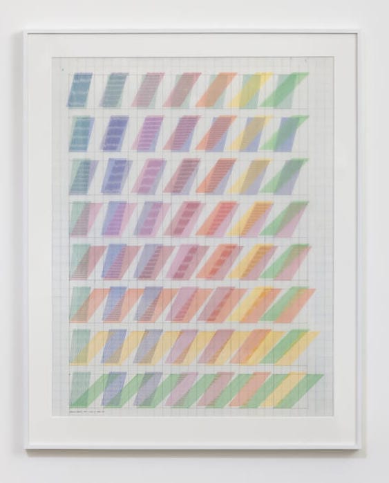 Beginning in the mid-1960s, the late Los Angeles-based artist Channa Horwitz embarked on a series of grid-based experimentations in serial art similar to those being undertaken concurrently by other artists like Sol Lewitt. Horowitz’s system was based on tracking permutations of variables such as color, shape, angle, and number, and the resulting works were much more colorful and rhythmic than other examples of seriality. Fittingly, her compositions could also be read as notations for music or movement. The exhibition To the Top at François Ghebaly featured a selection of works on paper and mylar showcasing the potential range within her limited system. The show was a somewhat bittersweet coda for this artist who was included in her first biennial and received a Guggenheim fellowship only the year before her death in 2013. An accompanying project by Haroon Mirza, titled A Chamber for Horwitz; Sonakinatography Transcriptions in Surround Sound, translated Horwitz’s delicate, spare works into an immersive environment of light, color, and sound. —MS