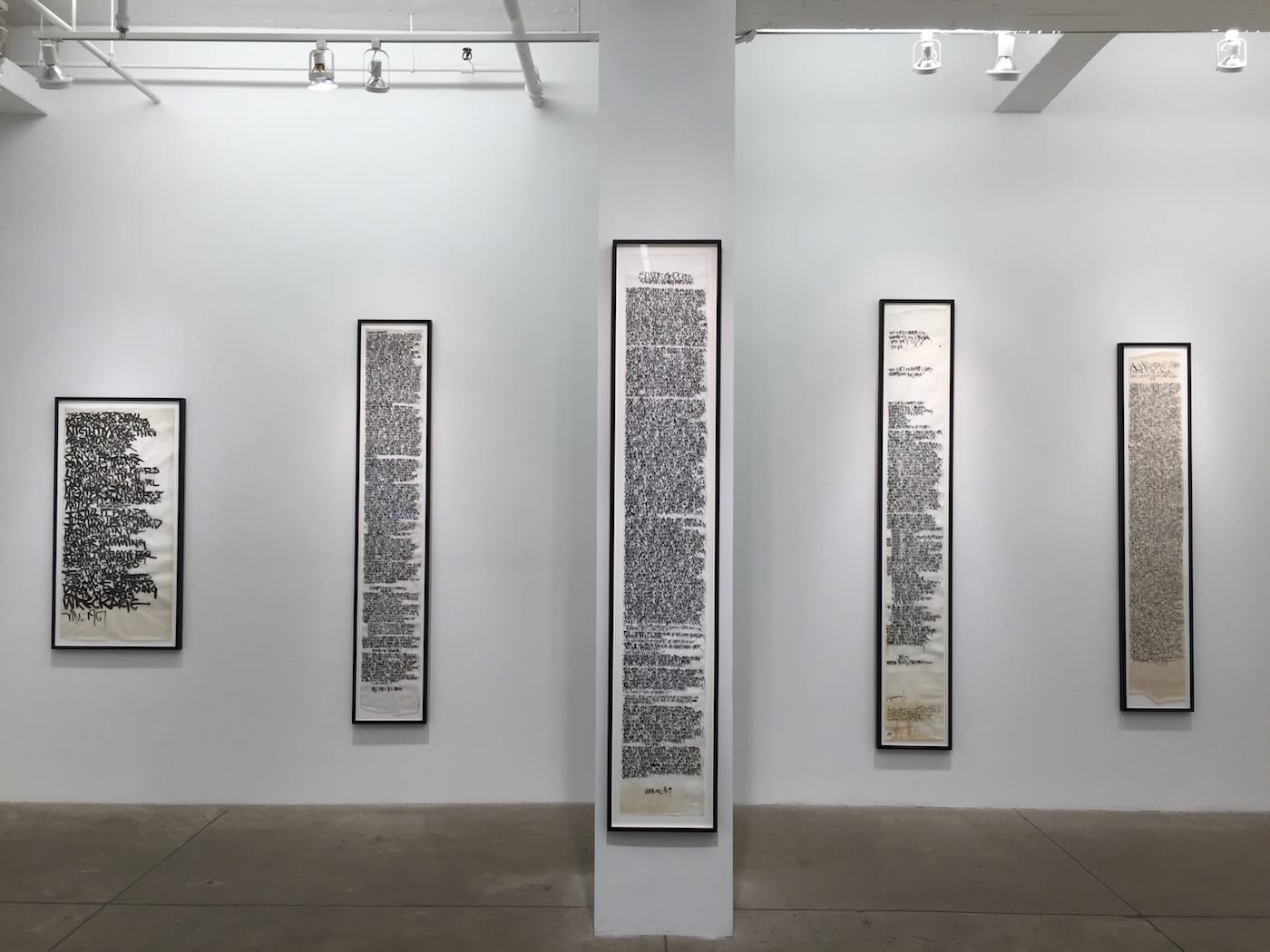 Walking into Martin Wong’s solo show at PPOW, it was hard to define what exactly was hanging on the walls. The works looked like ancient scrolls or steles, and from afar I was unsure if they bore a real or invented language. These visual poems span much of Wong’s career, from 1968 to 1999, and while less exhibited than his paintings, they comprise a deeply personal and consistent project that reflects many of his artistic inspirations. Most of the works are ink on vellum and cobble together conversations Wong overheard while living in California and later in New York, where he was especially drawn to the language of gang members, graffiti, and newspapers. He wrote in all caps, with some letters tilted and hardly any space between the lines. To read the words, you have to really focus, dive into the dizzying space of language. Elegantly laid out on pillars, walls, and plinths, Wong’s clusters of words pulled me in, from an intense description of a “Scarry Night” to a light, short dedication to “Love’s sweet residue.” —EWA