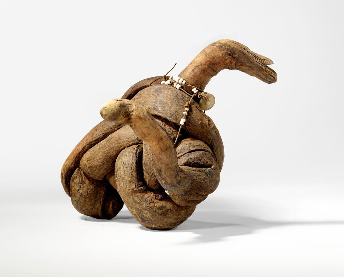 Inextricabilia, enchevêtrements magiques was impressive for its display of visual styles that stressed the compositional imbroglio of entanglement. The show wickedly mixed contemporary art with magical charms, sorcerers’ amulets, witchy spell thingies, and other knotty cultural objects. Included were numerous anonymous creations: a human skull trophy from Borneo, a voodoo Nikisi divination statue from the Congo, an undated Nala charm from Madagascar, and multiple 18th-century French and German reliquaries. One of the most powerful entanglements was a Doton magical amulet from Togo (Lome) that was created before 1832. Even when understanding the art historical context of the contemporary art of Louise Bourgeois and Annette Messager, their work here took on the associative voodoo of anti-modern non-causality. Also effected were mysterious string sculptures by Judith Scott and eccentric pieces by Arthur Bispo do Rosario, Pierrette Bloch, Cathryn Boch, Jules Leclercq, Man Ray, The Philadelphia Wireman, Marc Moret, Michel Nedjar, Virginie Rebetez, and Borbála Remmer. Ending the show was Michel Nedjar’s cunning wall installation of twisted “Dolls” (1998), in which hexing disorder and spell-like savagery jostle each other, vying to preside over an emergence of the grotesque that is typical of the private dream register. —Joseph Nechvatal
