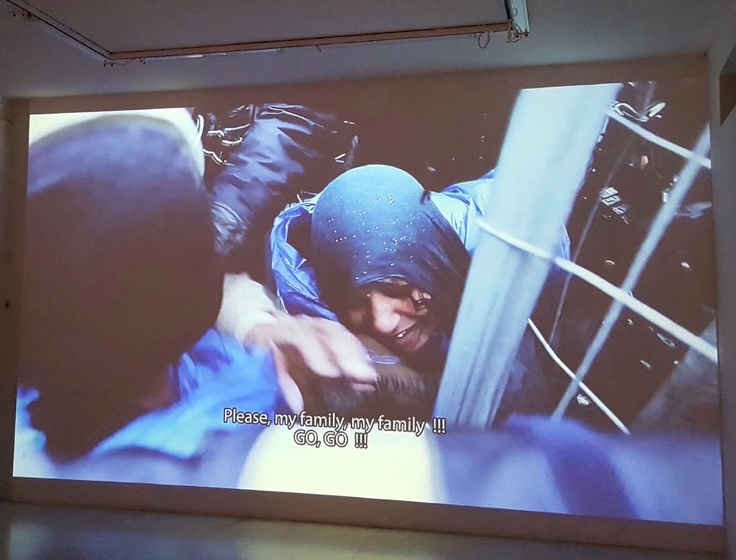 Since 2009, Rafa has been documenting the escalation of far-right extremism in Europe, and for this show at PS1, he presented several videos that are part visual ethnography and part war reporting of protests, rallies and marches mostly in the eastern nation states. Much of the footage is shot using a handheld camera that puts the viewer in the thick of the action: explosions, smoke from launched teargas canisters, martial chants and rocks and bottles being thrown. In one scene a teeming throng of refugees surge against gates through which only a select few are permitted. The police in riot gear lock arms in formation and try to hold the line, to keep order in a situation that is very close to tipping into full chaos. The human drama of these short, cinema-verité-style fragments make one viscerally feel the urgency of these crises, and connect them to similar situations in the US where the issues that have precipitated these calamities are also not going away. —SR