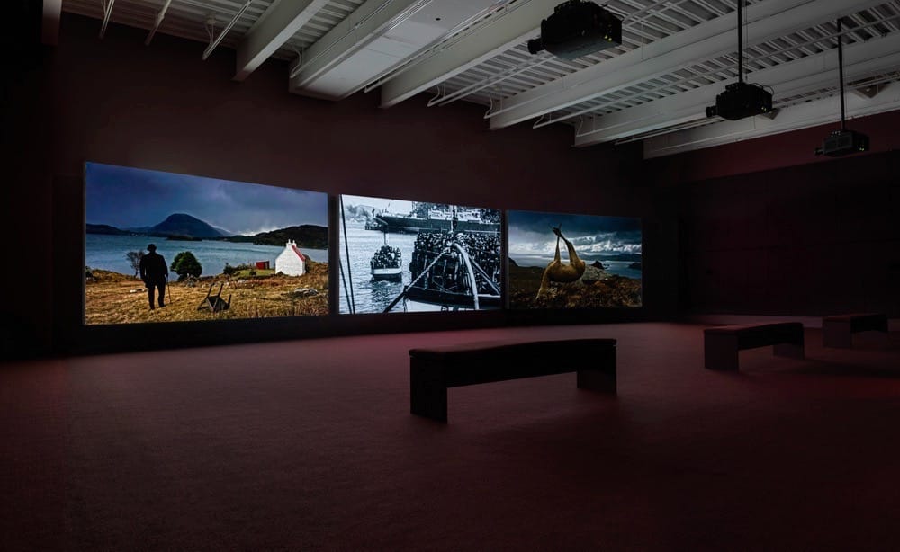 Entering the exhibition feels a bit like entering the welcome room of a large spaceship designed by Native Americans. The show’s entrance is dimly lit with a corridor that leads to separate light-based installations that bleed green and blue light. It’s all feels very 21st century until you enter the rooms. Then, time slows down.