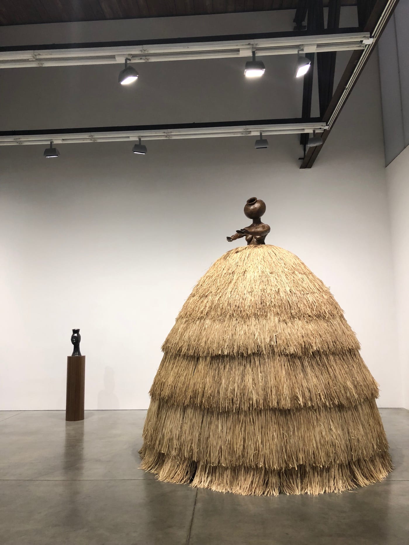 Simone Leigh synthesizes craft, cultural symbolism, and sculpture to construct totemic objects of Black female subjectivity that are conditioned by Afrodiasporic visual traditions. These ceramic vessels — busts melded with water jugs, and raffia skirts topped by female likenesses that also resemble houses — interrogate notions of labor and gender performativity, particularly those collective expectations of servitude that plague Black women. Those figures’ emotionless, featureless faces incur anonymity, though their postures are regal, which yields a body that is objectified. In this objectification of the Black woman’s body, Leigh calls into question what kind of autonomy and self-possession is available to Black women. —JW