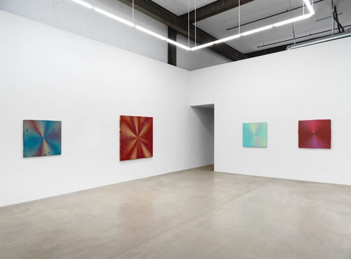 With a straightforward palette of desaturated primary and secondary colors, plus a gray or two, Faruqee and Driscoll’s gently spectacular Circle paintings are marvels of chromatic control. By overlaying two or more sets of slim, concentric bands slightly off-register, the artists put interference patterns into play and transform the surface of the canvas into a rippling, luminous field of ever-shifting admixtures of hue — daylight’s double. Fruitful contradictions abound in these stunning paintings, presented in Relative Brightness, among them the illusion of metallic sheen that emanates from their flat matte surfaces. The glitch-ridden precision of the artists’ technique demonstrates the indeterminacy inherent in a seemingly predetermined action. While that uncertainty may be disconcerting in some contexts, in these paintings it is exhilarating. —Stephen Maine