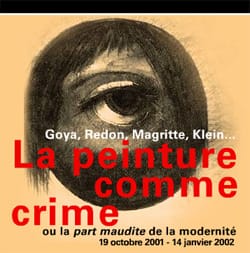 La peinture comme crime ou la ‘part maudite’ de la modernité – Painting as crime or the ‘accursed share’ of modernity at the Louvre in the fall of 2001. While it included a large group of marvelous Redon prints and some good Pollocks, they were overwhelmed by the thesis, which was to create a lineage of “transgressiveness and darkness” for a group of Austrian performance artists of the 1970s – I think – whose name escapes me. The videos of their performances were records of unbridled butchery that created rivers of gore, Peckinpaw-style – only the gore was apparently paint Add even more pretentious labels than usual, installing the Pollocks in a black box, with the paintings lit with barn-door spots that made them look like back-lit plastic versions of themselves, and a closing film clip of one of the concentration camps, supposedly justified by the question of whether it is possible to make art after the Holocaust, and you get the idea: pompous, over-determined, contemptuous to the included works of art, and often just plain offensive. In other words, a real winner. It’s also the only exhibition I’ve ever seen at a major museum that was preceded by a parental warning sign (apart from the erotica in the Met’s Art and Love in Renaissance Italy) At the Louvre, it was because of the violence, fictive and real.
