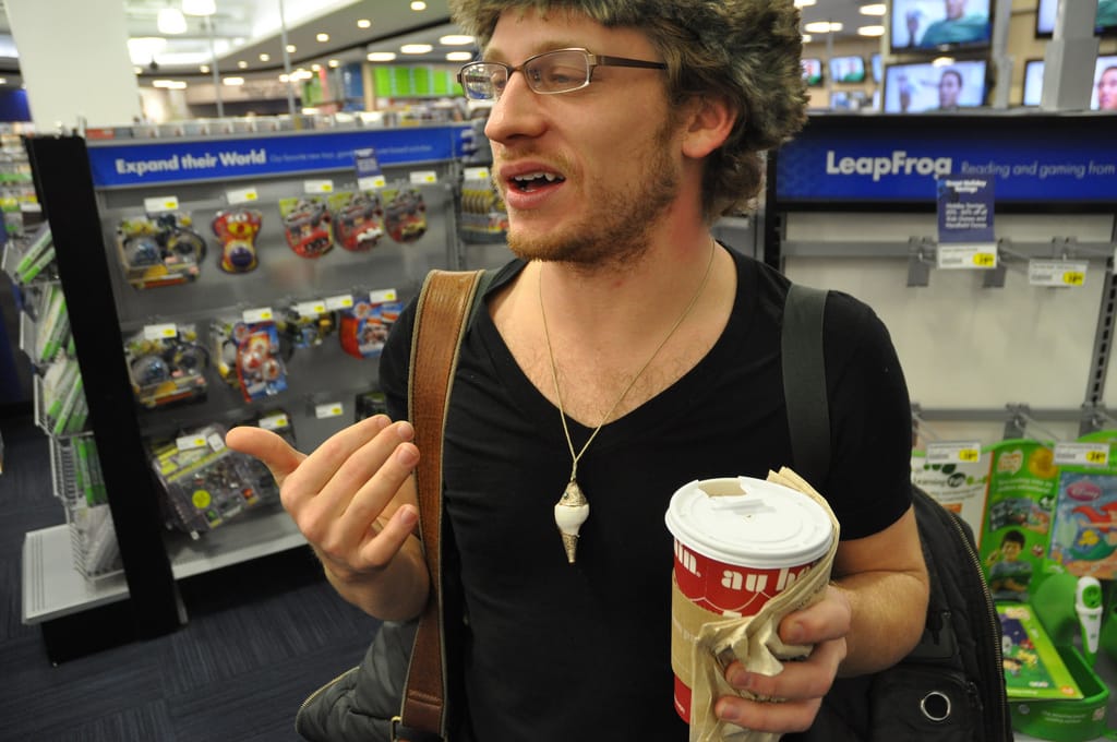 When I ran into him this morning I found him wearing headphones and drumming away in a corner of the store. His eyes were blood shot and he was glad to see me. I offered to buy him coffee and when his face lit up, I darted out and returned with a fresh cup. It was 8:30 am and I was a little surprised to find other people — who I assumed were not staging their own performance piece — already browsing the aisles.