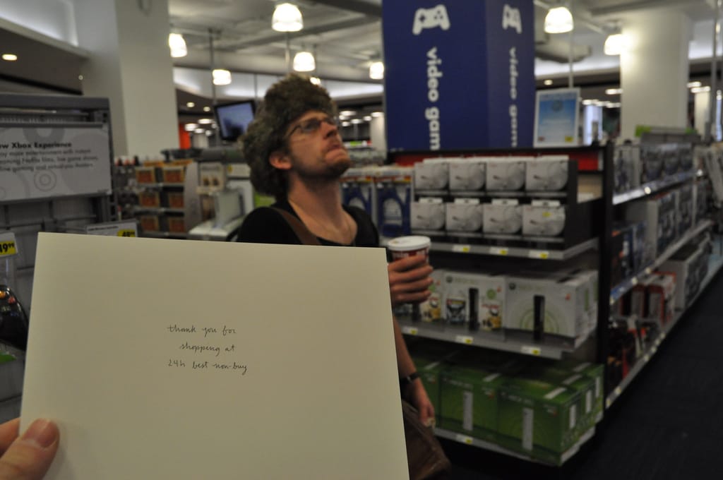 Before I leave he asks me, “Are you going to buy anything?” “No,” I say. He reaches into his bag, pulls out a small sketch pad and hands me a drawing, which consists of the words, “thank you for shopping at 24h best-non-buy.” My gift from him was 9/10.