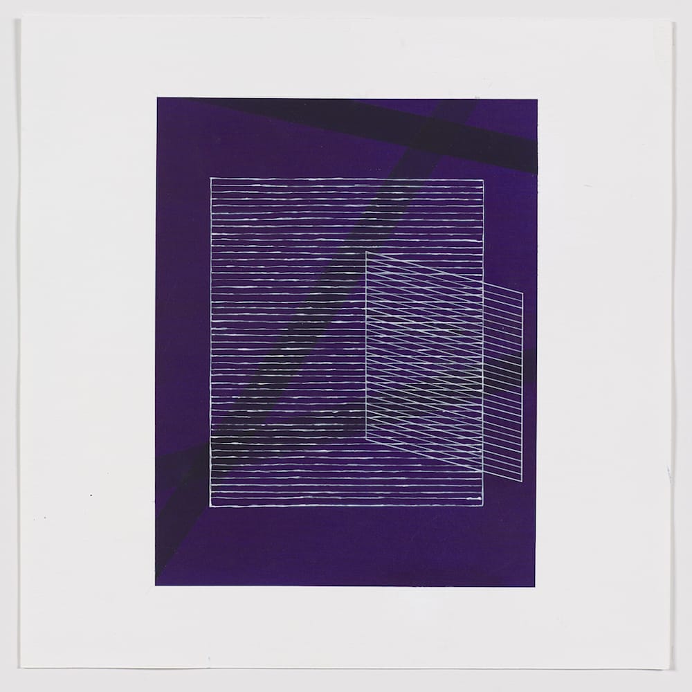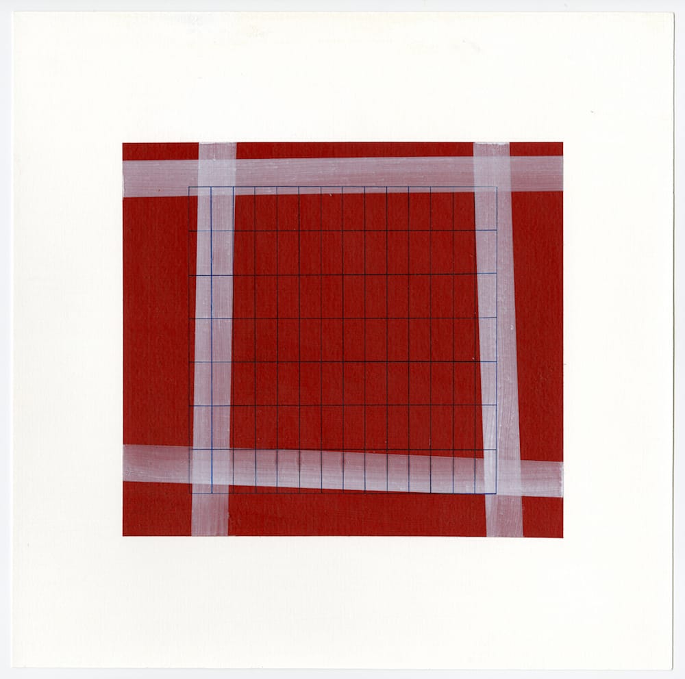 When I was looking at “Through Lavender,” this ethereal grid caught my attention long after I began piecing the painting together, examining the interstices where various grids were overlaid or sidled up to each other. The linear lavender frame and the three grids (red, black, and white) in slightly varying sizes, each occupy the painting’s square differently. While each’s grid’s relationship to the painting’s square seems perfectly balanced, and perhaps even arrived at mathematically, the overlaying of five structural configurations wreaks havoc with the eye’s desire for order and symmetry.