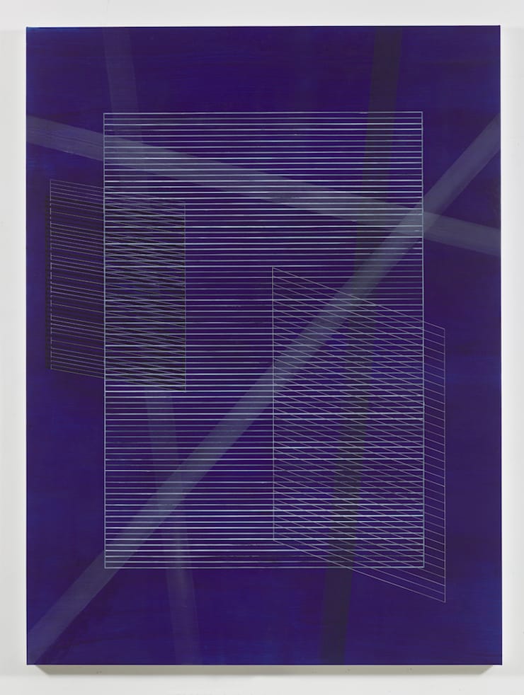 In the painting “Undertow” (2016), Kaufman creates a field from wide, looping, brushy blue strokes tinged with white. Against this rhythm, the artist imposes four different linear structures of varying visual intensity, from thick black lines to thin white ones, with see-through green bands in between. The resulting grids seem to be literally and metaphorically floating on these undulating waves of paint, with the green grid on the brink of dissipation. Have we built our structures on solid ground or shifting currents? A second white linear configuration extends across the entire surface with lines that are all askew. Within Kaufman’s ordered world, this is rather shocking, like seeing the president with his fly unzipped.