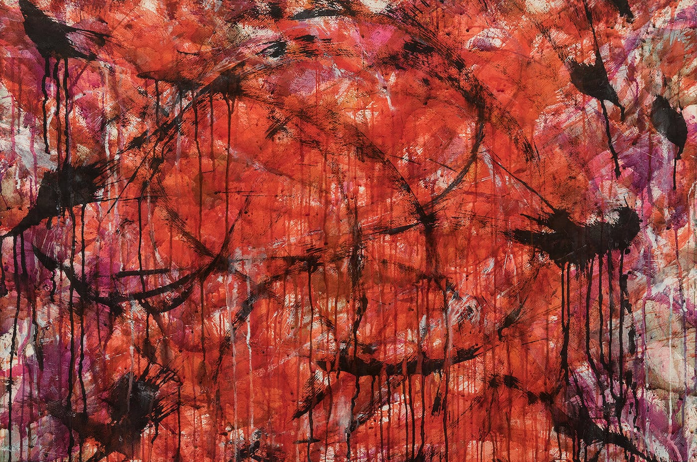 Although done within a shorter period, Bluhm’s work undergoes the biggest change, from layered fields of interwoven gestures and shapes, with drips running down the surface, to angular gestures in thicker paint. If the earlier group seems to anticipate the late paintings of Cy Twombly, the difference is that Bluhm’s works are more frenetic, with the splashes and drips conveying a violent encounter between the surface and the artist’s loaded brush; the drips become a steady stream of tears.