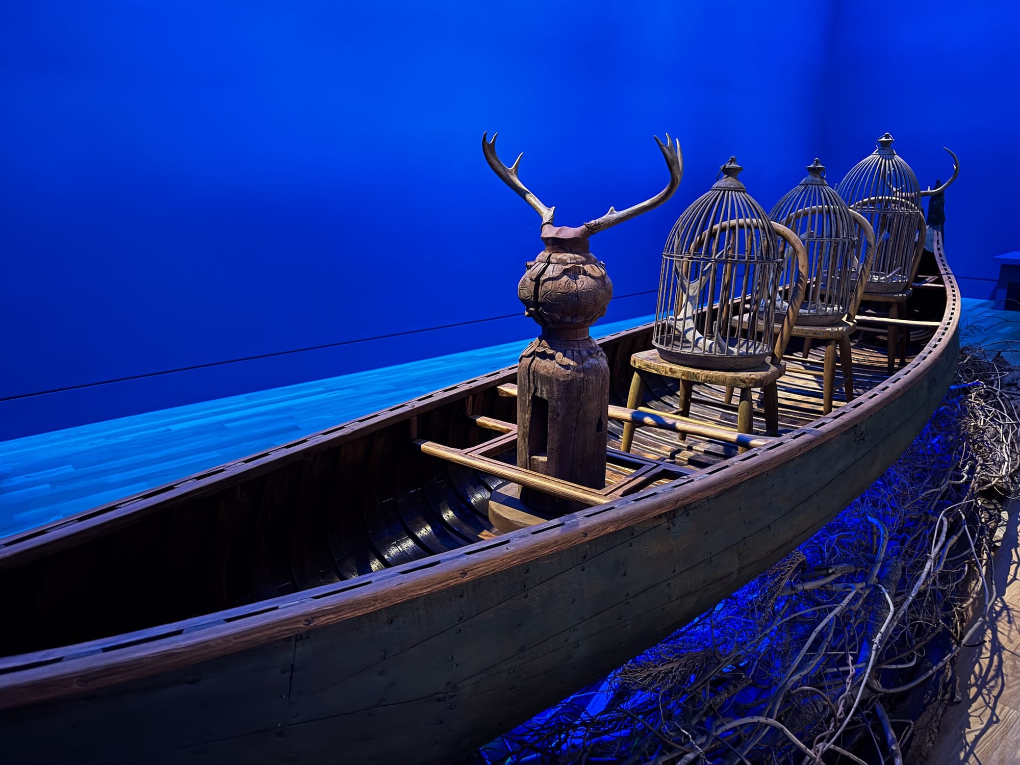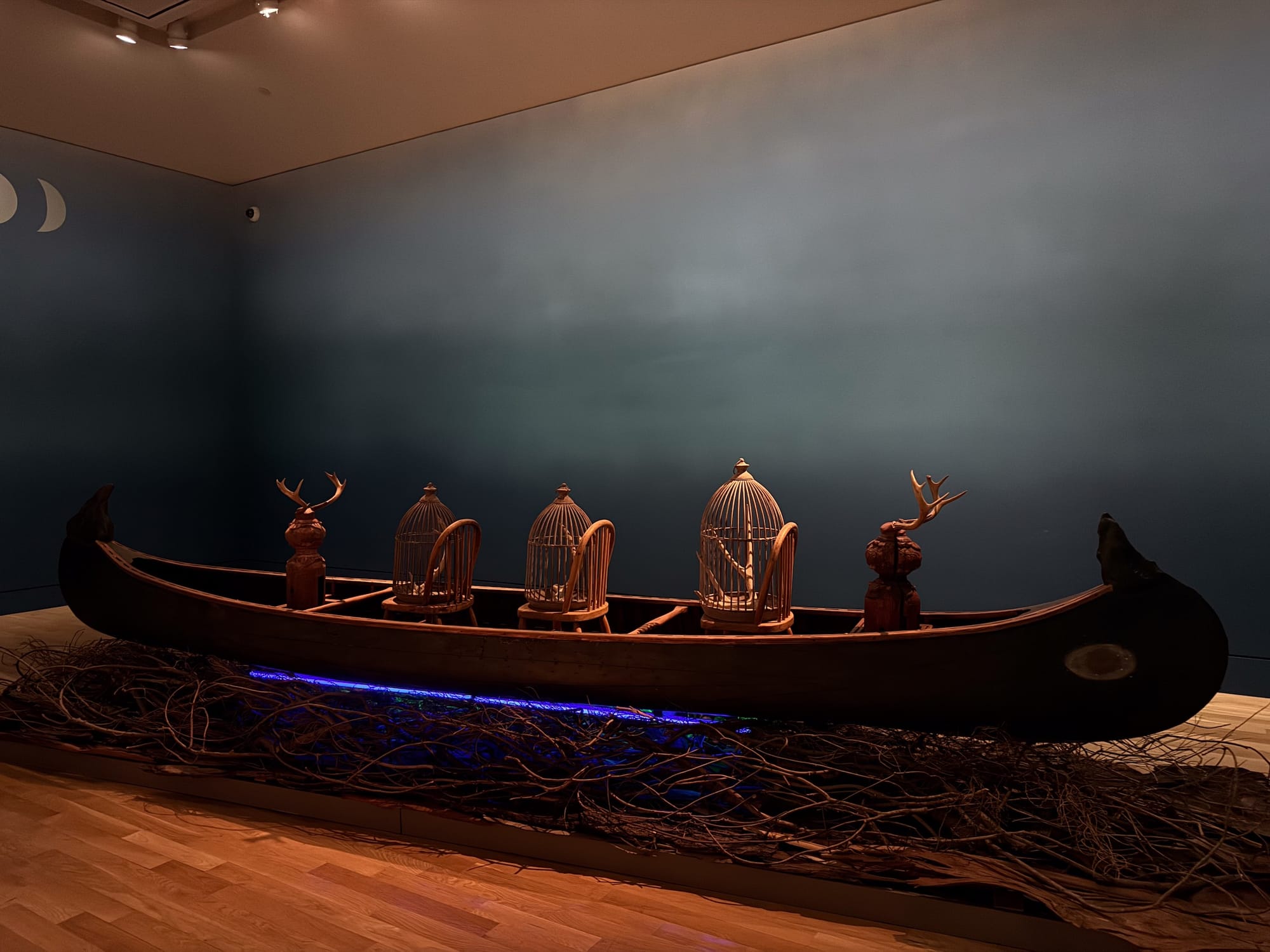 The phases of the moon are painted on the wall in a matte metallic silver, and a small poem by Saar is draped across the wall: “The moon keeps vigil as a lone canoe drifts into a sea of tranquility seeking serenity in the twilight.” In the middle of the room, a long canoe, 17 feet across, sits atop a bed of branches, bramble, and sheets of jagged wood. At either tip of the ship is a watchful eye guiding the raft in both directions. Two sentinels — antiques affixed with antlers — keep watch at each end. Saar has crafted a fantastical scene; you can envision the boat careening upriver, striding forth.
