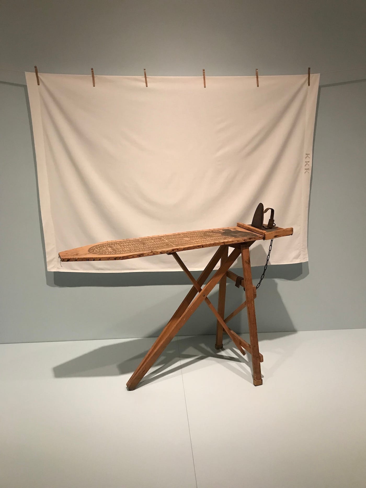 If slavery is a dirty business, then who gets things clean? Saar answers that question with a silent shudder. “I’ll Bend But I Will Not Break” (1998) and “A Loss of Innocence” (1998) are two such subdued responses. Created in the same year, both works include pristine white fabric conveying an upsetting message. “I’ll Bend” is a sculptural tableau that overlays the slave ship blueprint onto a similarly shaped ironing board. The backdrop here is a large, rectangular white sheet with the letters “KKK” appliquéd. This piece collapses many of the artist’s themes into one image: traditional female labor, the history of slavery, and working-class chores. Of the work, Saar has previously observed that, “In order [for a Klan member] to wear a clean sheet to a Ku Klux Klan [rally], a black woman had to wash it.” The absence of a laundress provides a hint of narrative to the work. The iron looks to have burnt the wooden laundry board, indicating the maid’s sudden departure from the scene. Has she abandoned her post in protest, or was she taken away?