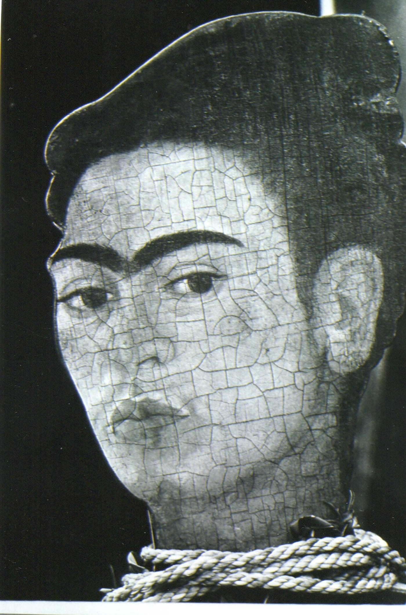 This set of photographs defines a singular territory bordered by Aaron Siskind’s abstract photographs and Mimmo Rotella’s décollages made from torn advertising posters. The original subjects inform Smith’s interest in distressed surfaces and images. Whereas Rotella manipulated his found materials by tearing away and cutting into the layers of advertisements that had been pasted one atop the other, Smith photographs what the posters have endured. In contrast to Siskind, who framed his shots so that they would underscore the abstract elements of line and texture, Smith focuses on the damaged, ragged, and battered. Taken before the movie Frida (2002) had its world premiere, Smith’s black-and-white photograph, “Frida”  (New York, 2001), shows a craqueled, cutout of the artist’s head, which takes up most of the photograph. It is almost as if we looking at a painting in need of restoration. What makes this photograph disturbing is the rope that has been wrapped around Frida’s neck a number of times.