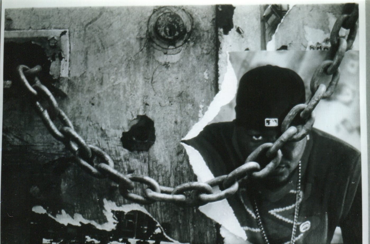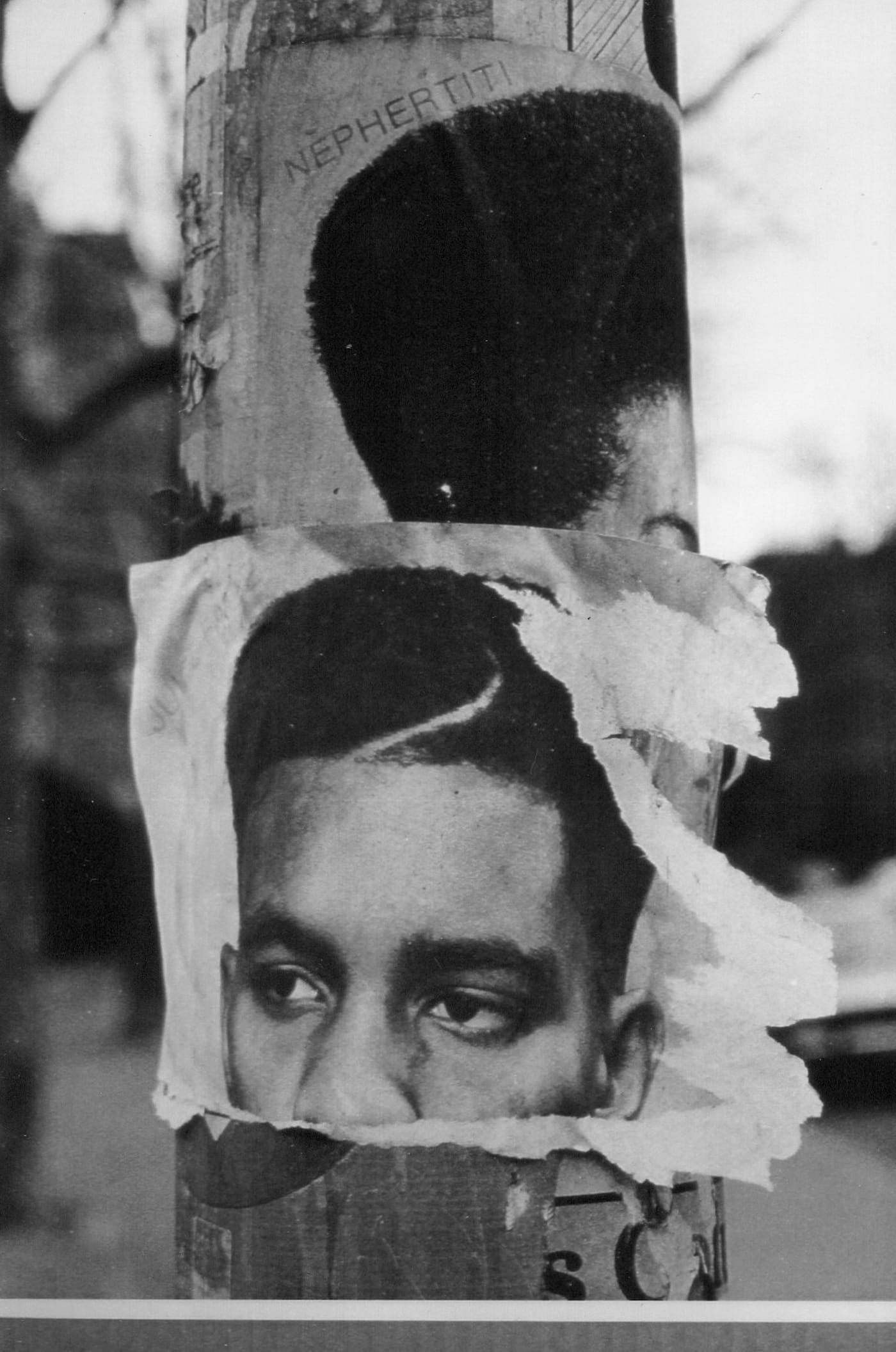 In “Nephertiti” (Brooklyn, 1999), Smith photographed two posters, one on top of the other and partially covering it. In the uppermost poster, we see a young black man with the lower half of his face, including his mouth, torn away. The poster is fixed to a pole on a city street; the mouthless black youth sees what is going on but is unable to talk about it. In “Youngstown to Cincinnati, Ohio” (2000, New York), a ripped poster of a black man wearing a baseball cap backwards, with the MLB logo on full display, is partially obscured by a heavy catenary chain looping down from a latch in the photo’s upper left corner and disappearing into the upper right. The man is staring intensely past the thick chain, directly at us; one of whose links covers his left eye.