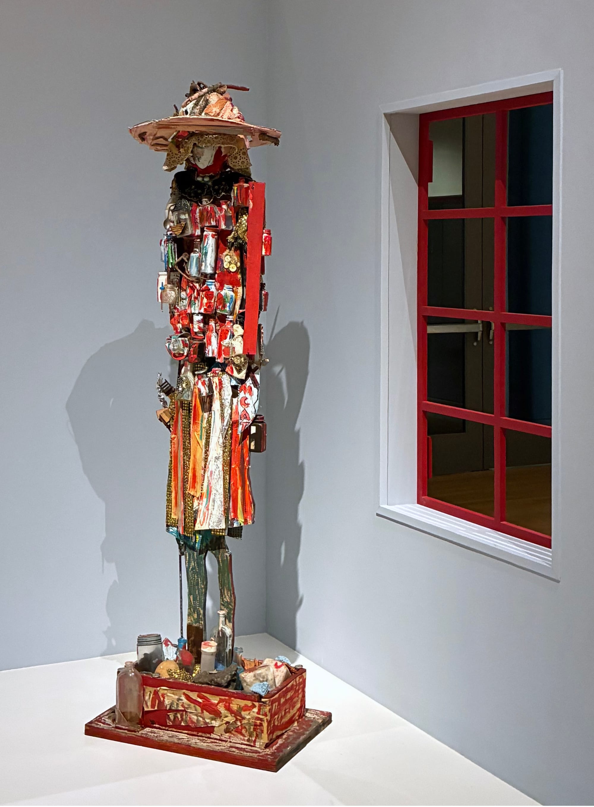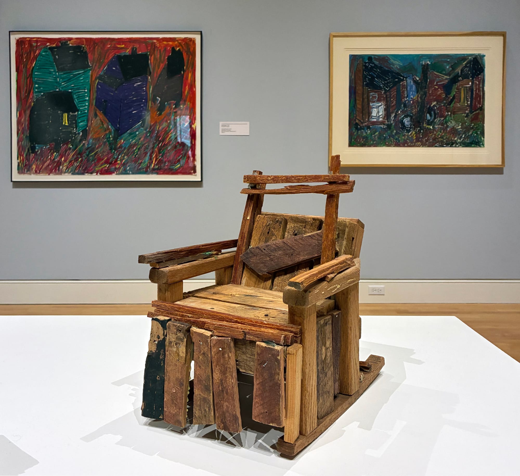 The main feature — Shacks, Stories, and Spirit: Beverly Buchanan’s Art of Home, at the Georgia Museum of Art through June 28 — is a small exhibition, taking up one gallery within the museum. It’s here that we’re introduced to “Medicine Woman” (1993), a major and canonical work of Buchanan’s, gifted to the museum in 2015 by the artist’s estate. The work is a tall, standing self-portrait assembled from found scraps of wood, painted jars with visible brushstrokes, and scraps of textile. She has a cane, and she stands atop a handmade box that is filled with medicine bottles, rocks, and other scraps of ephemera from around the artist's home.