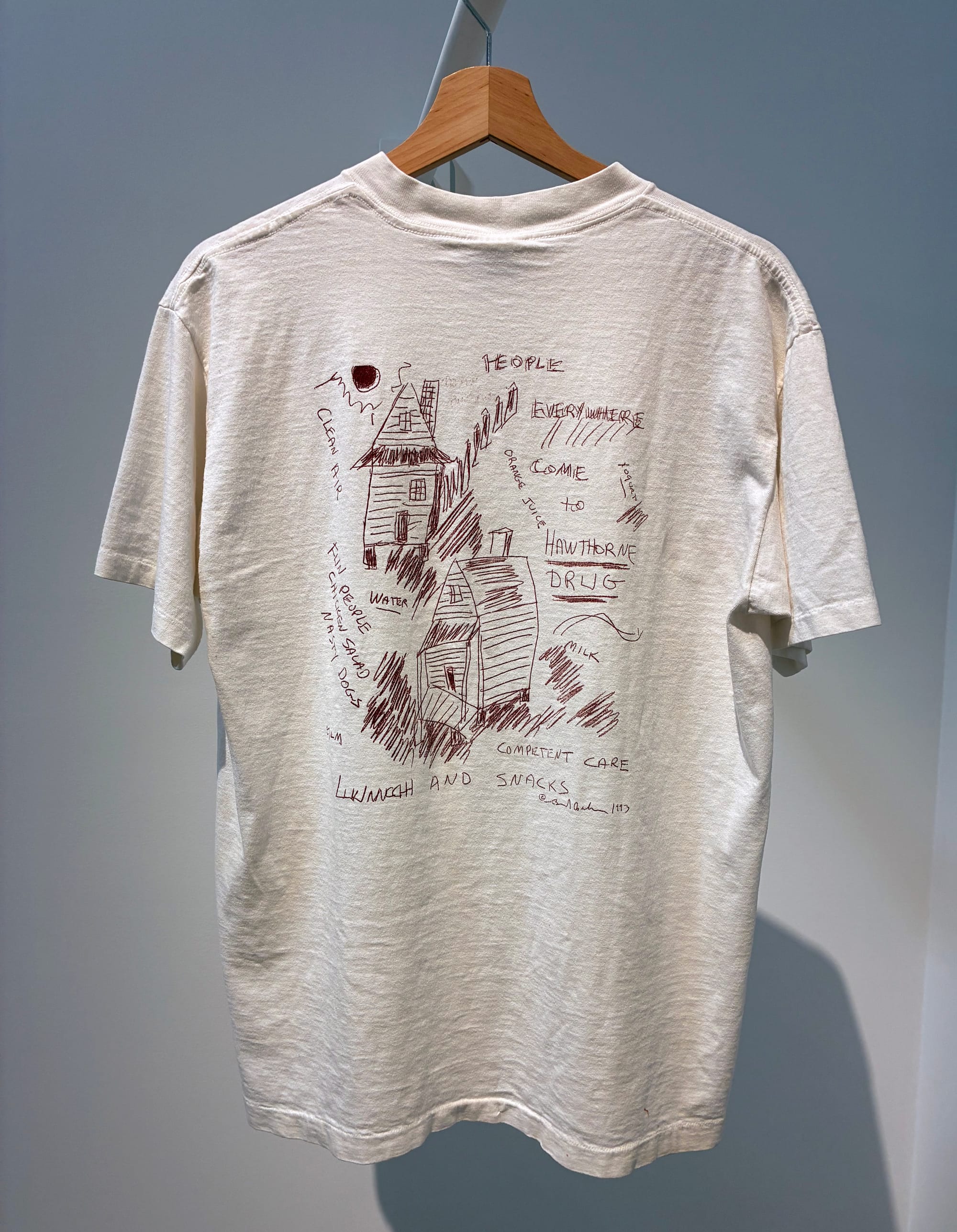 Fitting with that aesthetic of sharing, the Athenaeum has been transformed into an artist's den, each item bearing a provenance of its creation and exchange. A custom T-shirt for Hawthorne Drug Co, for instance, hangs in a small, built-out section of the gallery that explores the importance of that pharmacy for Buchanan, which she described as “a social, friendly place where you can eat lunch while waiting for your arthritis medicine.” The T-shirt is printed with two of Beverly’s shacks, scribbles indicating grass, and text that reads“Everyone come to Hawthorne Drug” along with “FUN PEOPLE CHICKEN SALAD NASTY DOGS,” “Luuunnnncch And Snacks,” “CLEAN AIR,” and “Competent Care.”