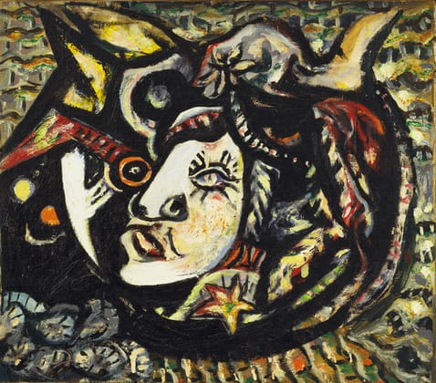 Kimmelman is right in the sense that the shear originality of the drip paintings certainly overshadow the earlier works that reveal Pollock’s influences. But they have their own verve and derivative is not always a kiss of death. For example, that little “Mask” (1941) may rhapsodize on a dear theme to Picasso. But Pollock makes it his own with that electric twinkle in the mask’s eye and the rich clutter of color that surrounds the object. Pollock’s early works are not the drips everyone knows and glorifies. They are a funky jumble. There is an old saying I’ve heard, “you can’t go to the hardware store looking for oranges.” Likewise, you can’t go to these early works expecting the zen of the drips. They offer something else that the drips can’t.