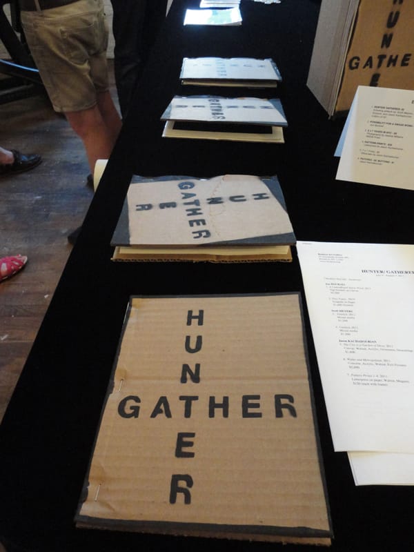 In the most recent Williamsburg Greenpoint News + Arts (aka WG News), Lusty designed an insert, promoting Hunter/Gatherer as well as Booklyn’s latest efforts. Unfortunately, aside from this WG mention, I haven’t read much about Booklyn’s summer shows, a disappointment considering I find them to be some of the most thoughtfully arranged group shows I’ve seen in a while.