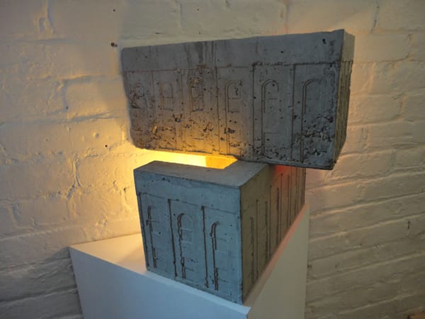 Jason Kachadourian contributes both curious sculpture and elegant letterpress puzzle piece prints to the show. Knowing Kachadourian’s work, both the patterning and the architecture are familiar, having presented themselves in premature forms in his earlier silkscreen works; the letterpress and illuminated sculptures suit him.