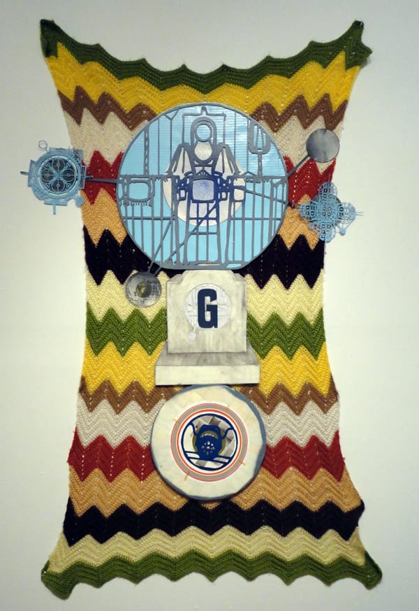 Scott Meyers’ mixed media collages — or drawings? — are a welcome component, displaying the connections between print and sculpture, and how the artistic processes of working with either is not mutually exclusive. In Hunter/Gatherer‘s curatorial statement, Lusty emphasizes each artist’s use of found objects. While clearly a commonality, each artist uses found objects in a different way, making the work that much more dynamic.