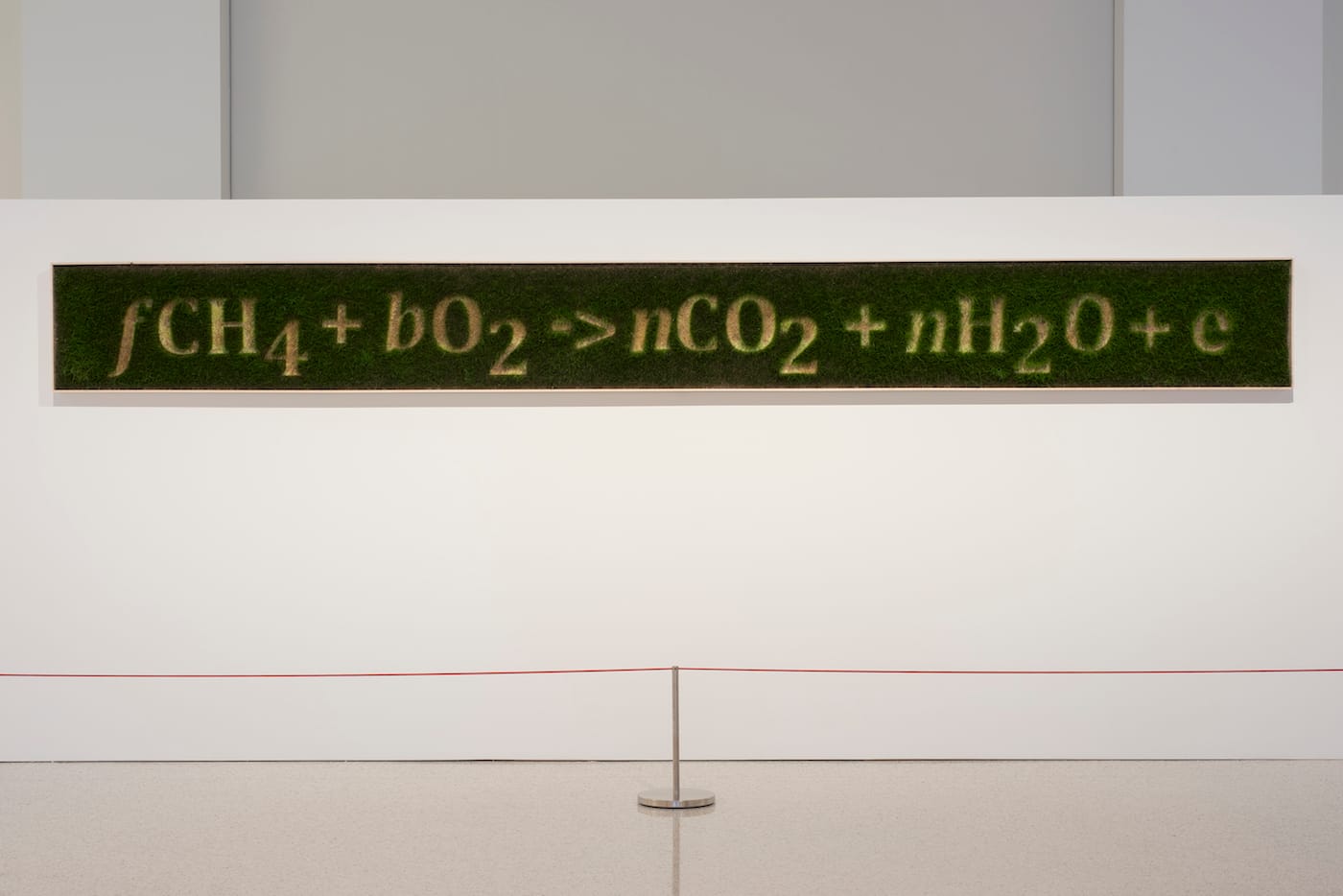 Recent artworks in the exhibition further emphasize the imbalances in our relationship with nature. Ackroyd & Harvey’s sobering “Satanic Formula (after Senanayake)” (2017) stretches for several feet in the museum’s sunlit atrium. Sunlight literally powers the piece; a thick, green carpet of sprouting grass covers its front. But etched in all that green is a scientific formula devised by Ranil Senanayake, a systems ecologist and a pioneer in the field of “analog forestry.” His formula shows in mathematical terms that, as we burn more fossil fuels, we increase the amount of carbon dioxide in the atmosphere. Meanwhile, oxygen levels are falling: “The only thing that keeps the global concentration levels up,” wrote Senanayake in 2017, “is photosynthesis by leaves and plankton.” In other words, plants keep us alive.