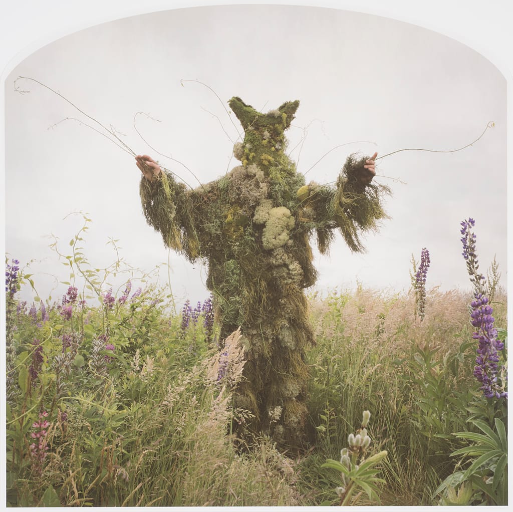 Nicholas Kahn and Richard Selesnick’s playful “King of Weeds” (2013) helps to suggest that a different relationship is possible. Their photograph depicts the artists’ recent performance and installation series “Truppe Fledermaus & the Carnival at the End of the World.” A man stands in a field that blooms with life, covered from head to toe in a wide variety of weeds. The figure suggests that, just maybe, we can finally recognize the interdependence of humans and plants. Is a weed an invasive species? Or, in the words of Ralph Waldo Emerson, a “plant whose virtues have not yet been discovered”?