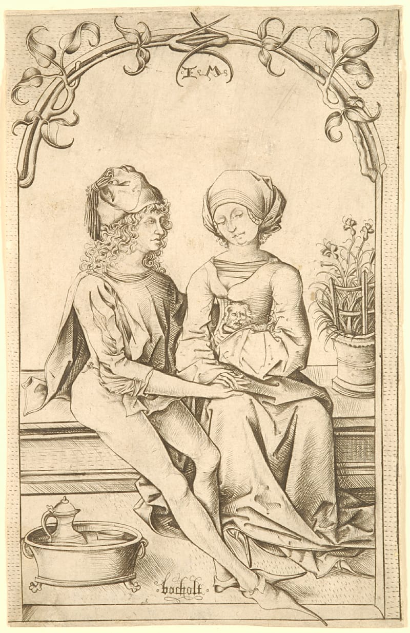 Among the oldest objects on display is “The Lovers,” a late-1490s engraving by Israhel van Meckenem the younger. It depicts a “pleasure garden,” in which a man and woman sit under an archway of flowers, presumably seeking privacy in which to whisper sweet nothings. By centering on the human figures, the engraving embraces the age-old belief that the natural world exists only to serve human needs.